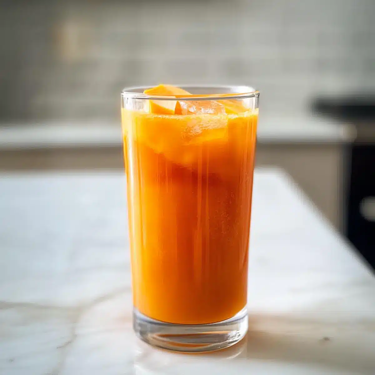 Sobald der Saft fertig ist, gieße ihn in Gläser, die du zuvor mit Eiswürfeln gefüllt hast. Die kühle Temperatur macht den Aprikose Pfirsich Süßkartoffelsaft zu einem erfrischenden Genuss, besonders an warmen Tagen. Du kannst auch mit einem Garnitur aus frischer Minze oder einem Strohhalm für zusätzlichen Flair sorgen. Der lebendige orange Farbton wird deine Familie und Freunde beeindrucken.