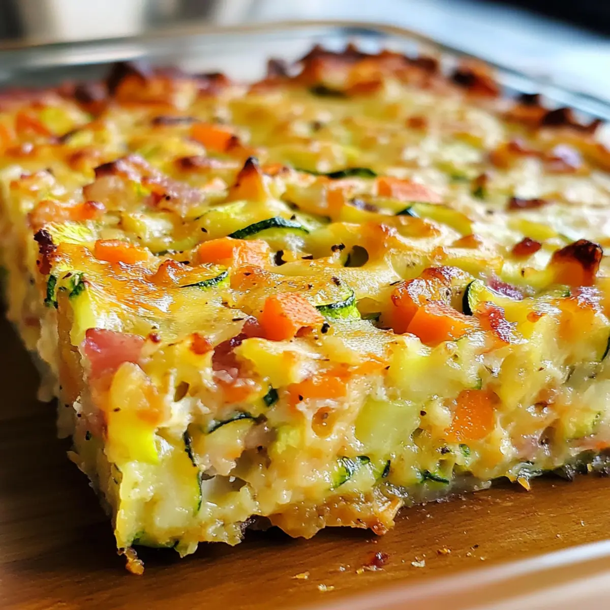 - Gemüse und Speck mischen: Zwiebel, Speck, Zucchini, Karotten und Cheddar in einer Schüssel vermengen.