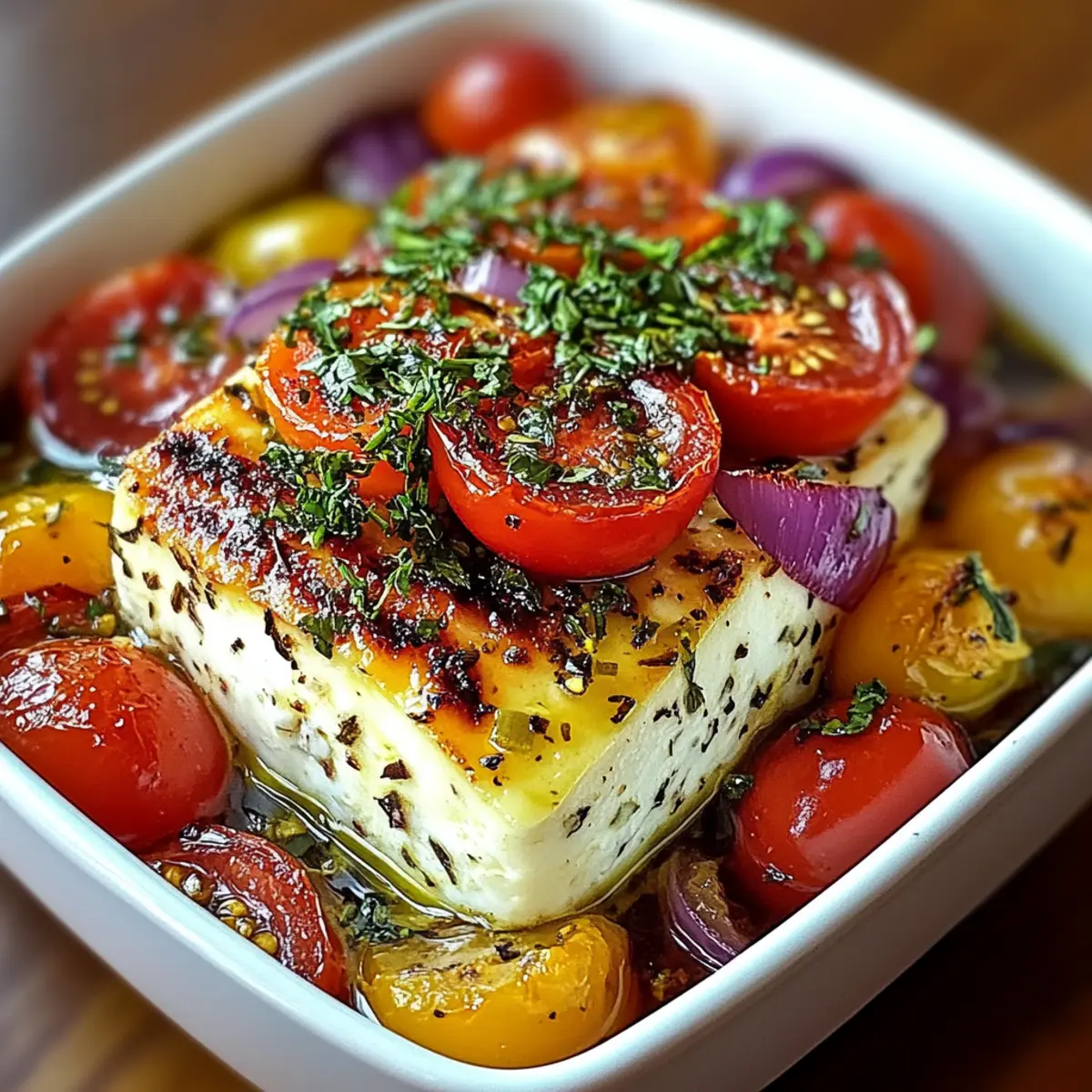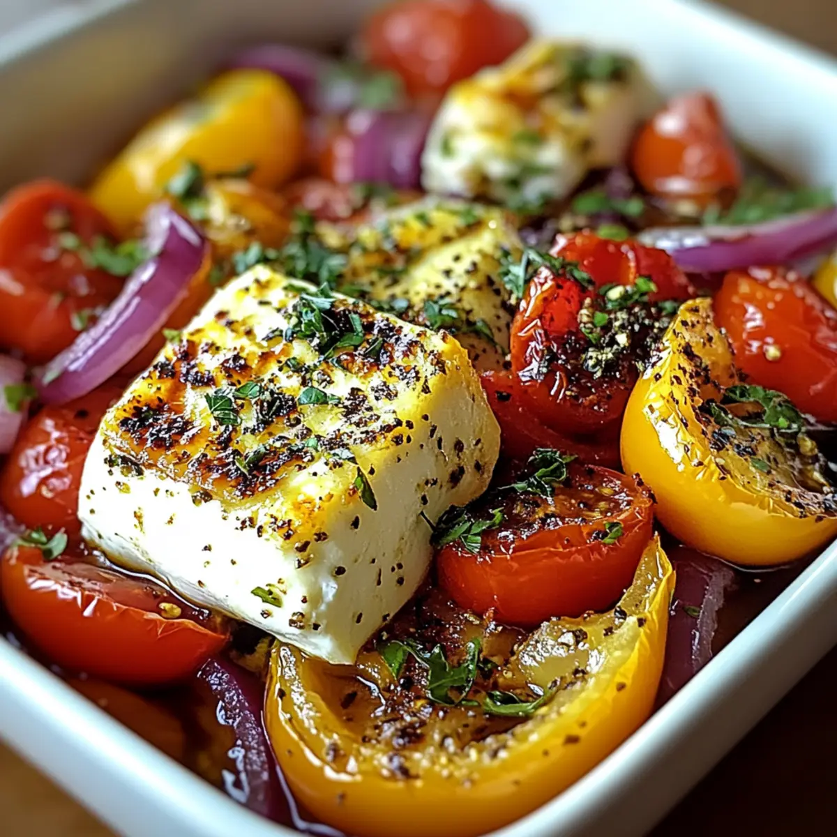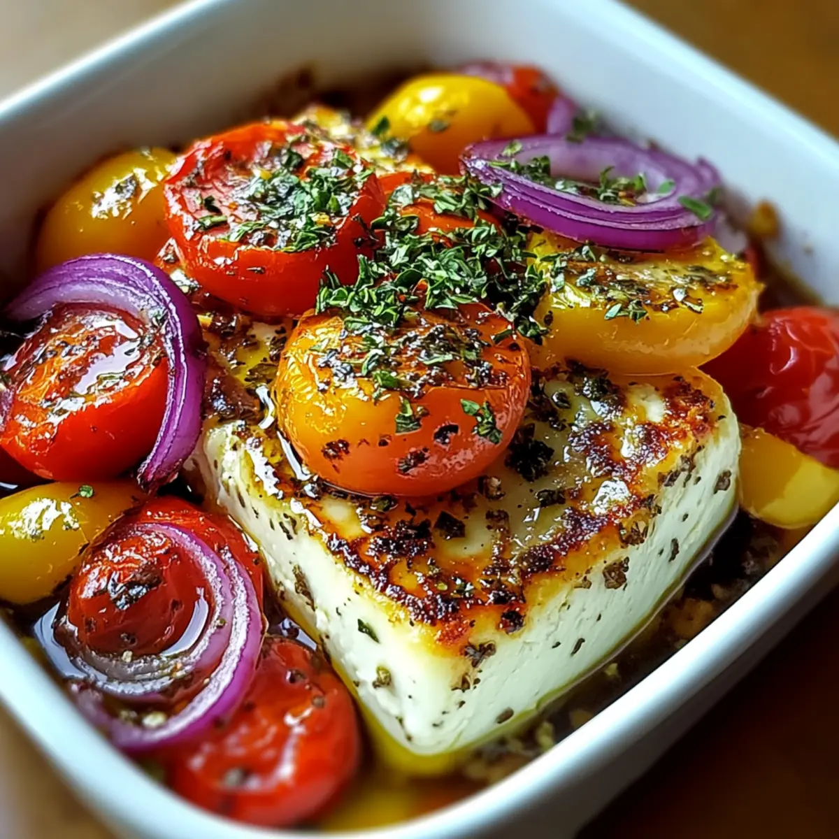 - Verteile die geschnittenen Tomaten, Paprika und Zwiebelringe um den Schafskäse.