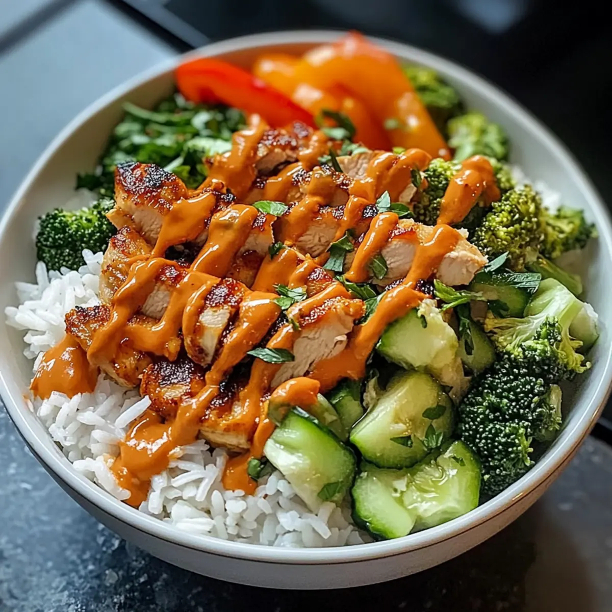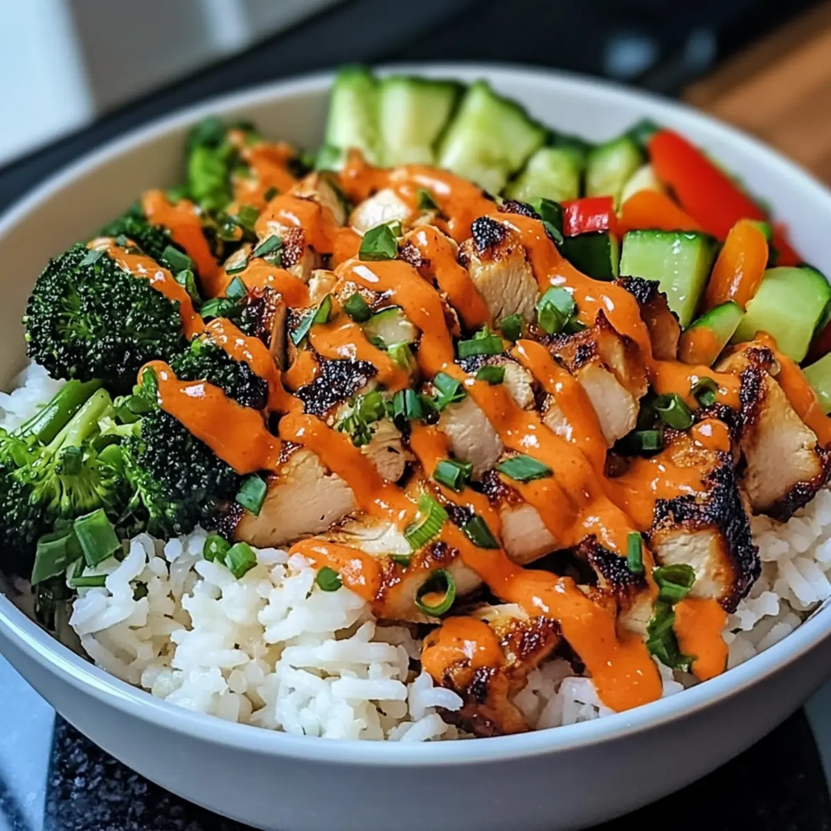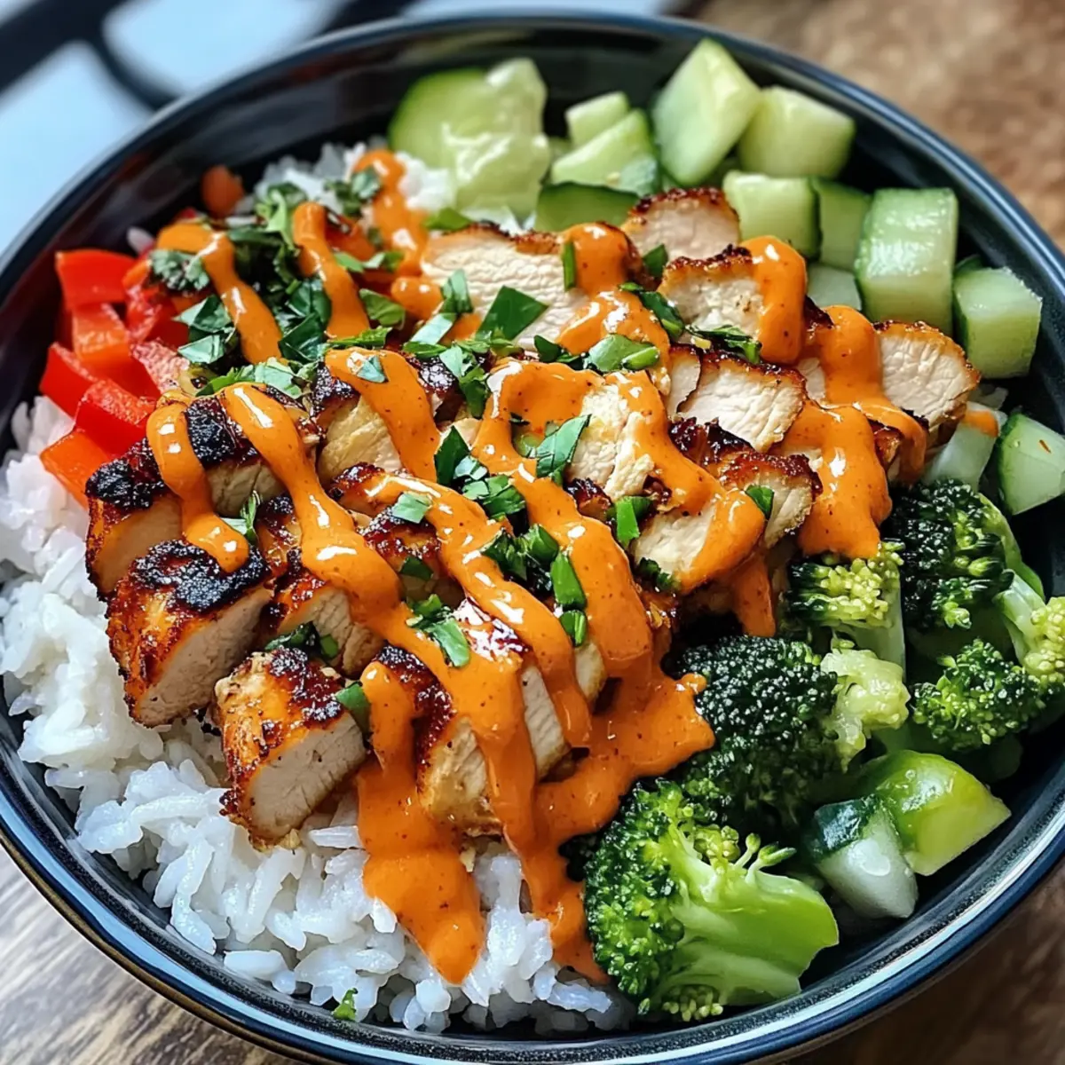 • Hier sind die Zutaten für ein geschmackvolles Bang Bang Hähnchen Bowl.