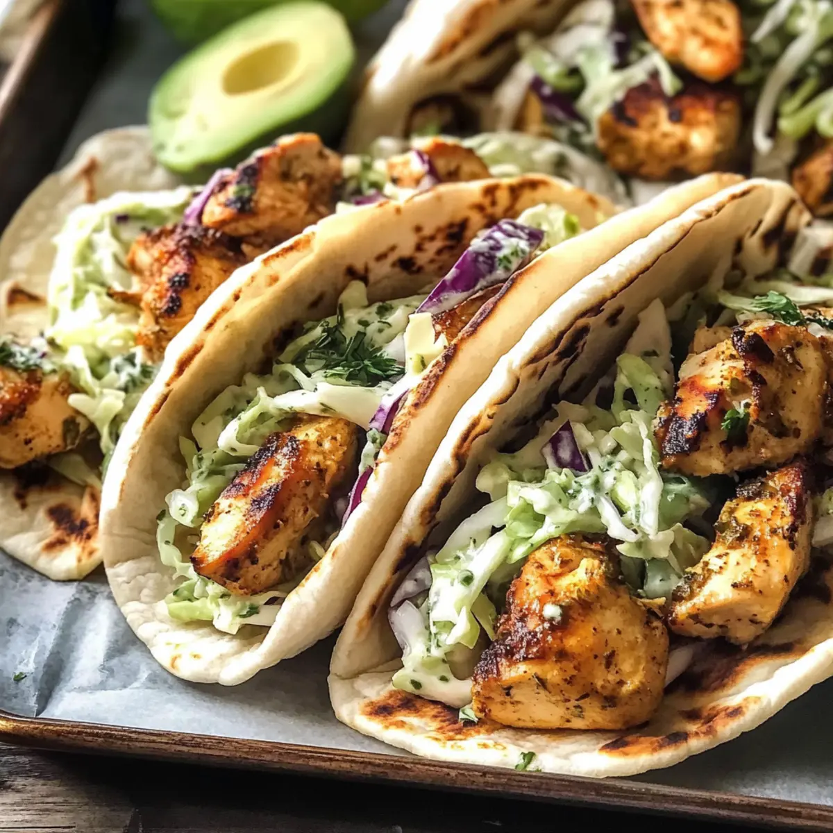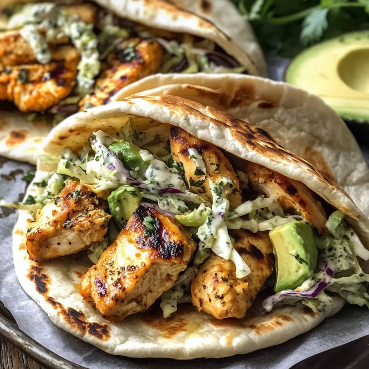 - Warme Pitas mit der Kräuterslaw, dem Hühnchen und der Avocado füllen und servieren.