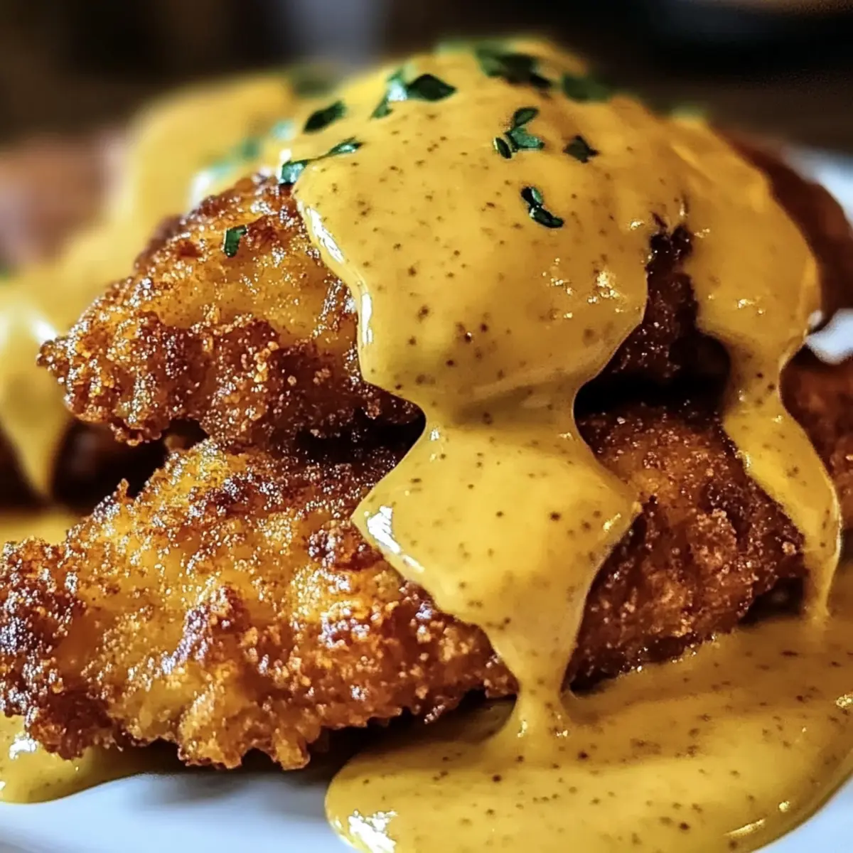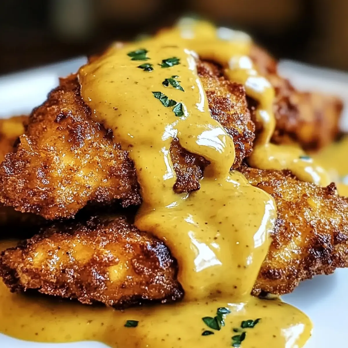 Brezel-Hühnchen mit cremiger Senf-Cheddar-Sauce