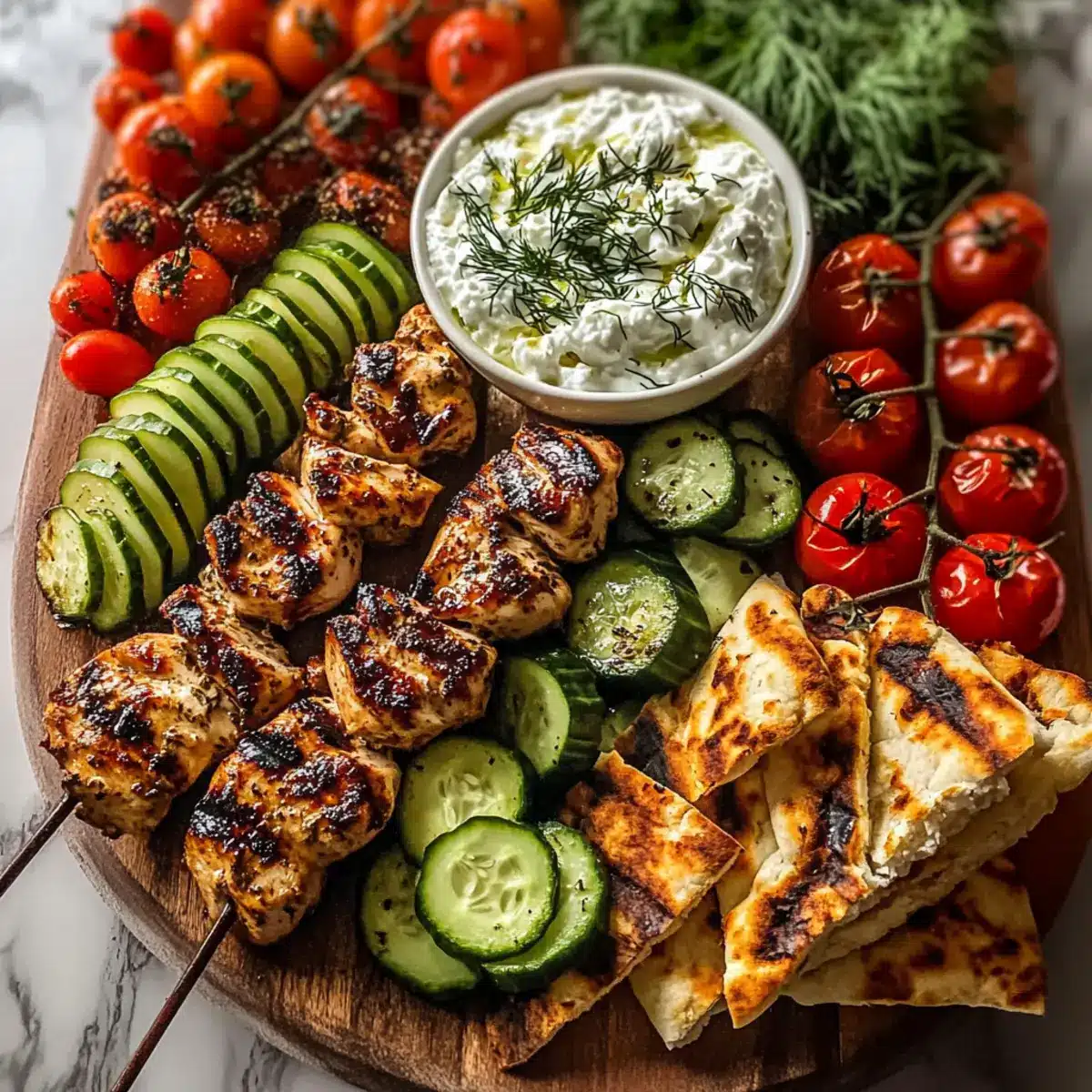 Hühnchen Souvlaki Schlemmerbrett mit Feta Dip