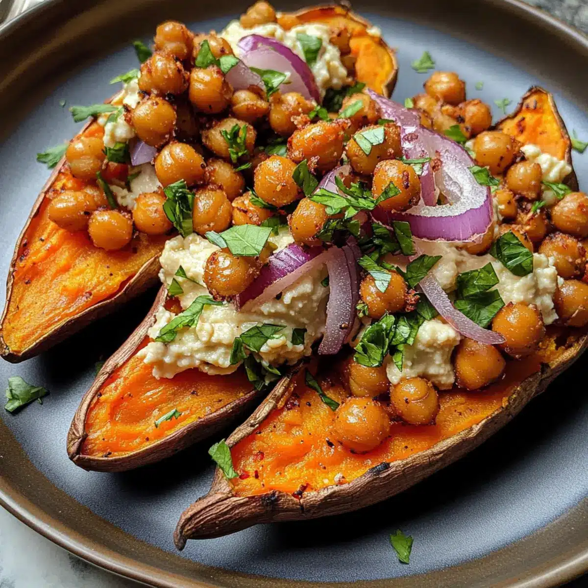 Gefüllte geröstete Süßkartoffel mit Kichererbsen