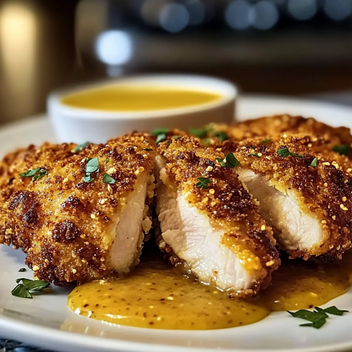 Hähnchen mit Brezelkruste und Honig-Senf-Sauce genießen