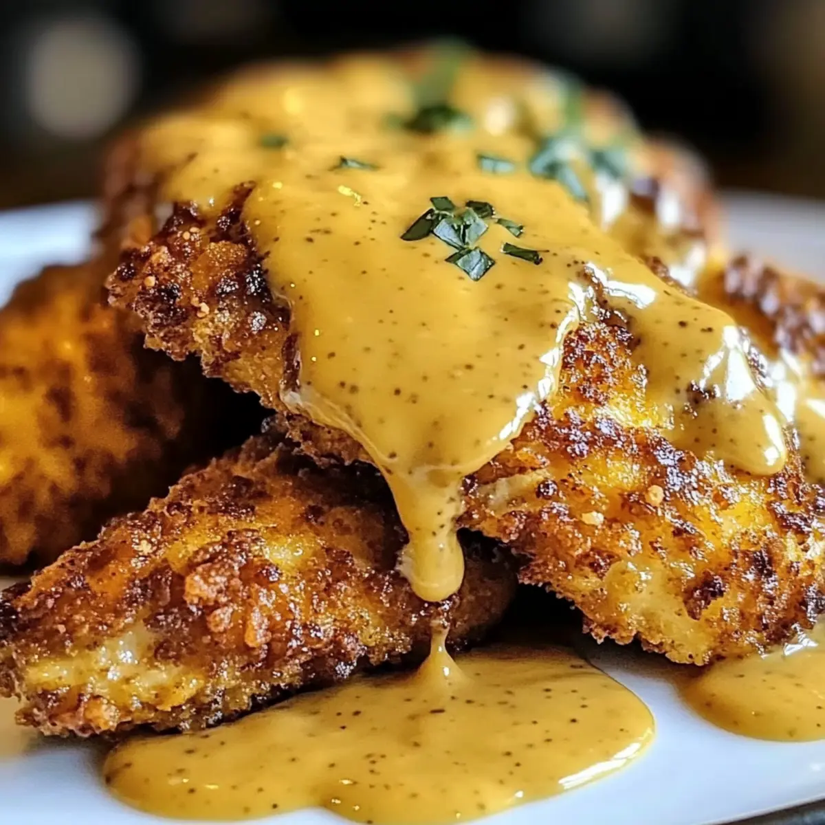 Brezel-Hühnchen mit cremiger Senf-Cheddar-Sauce