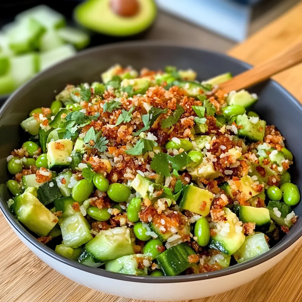 Knuspriger Reis-Salat mit Avocado und Edamame