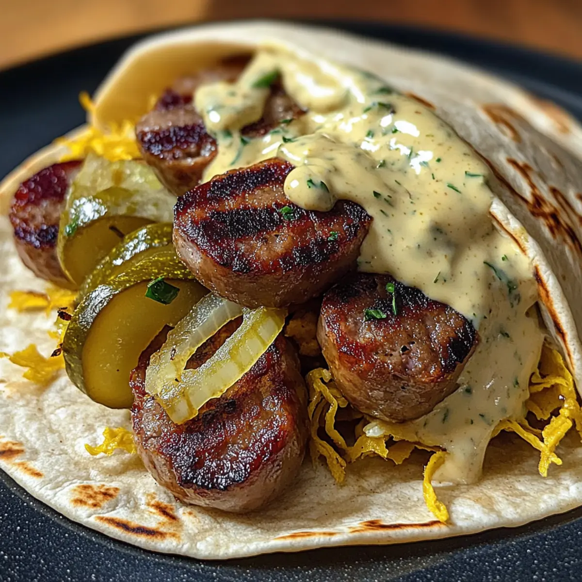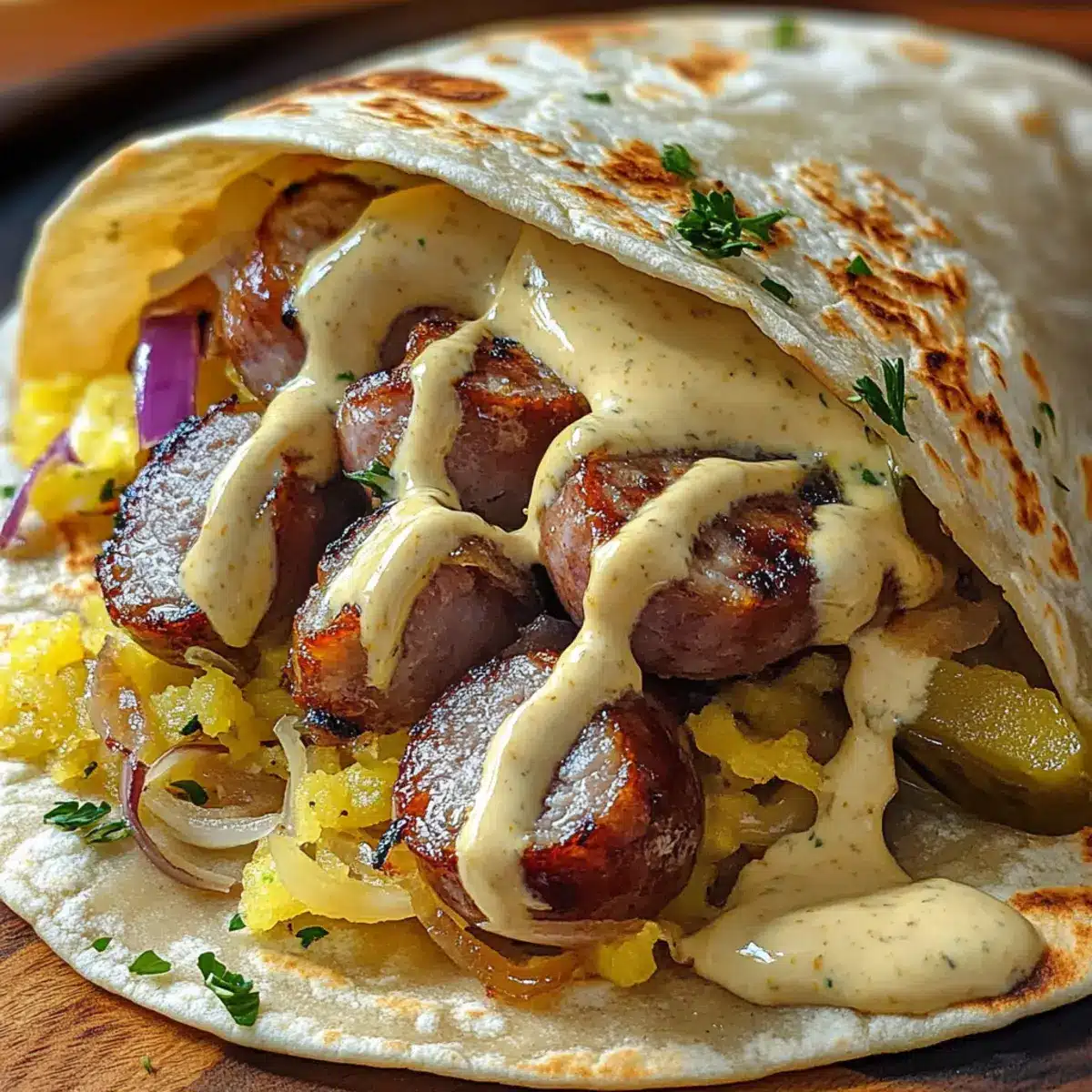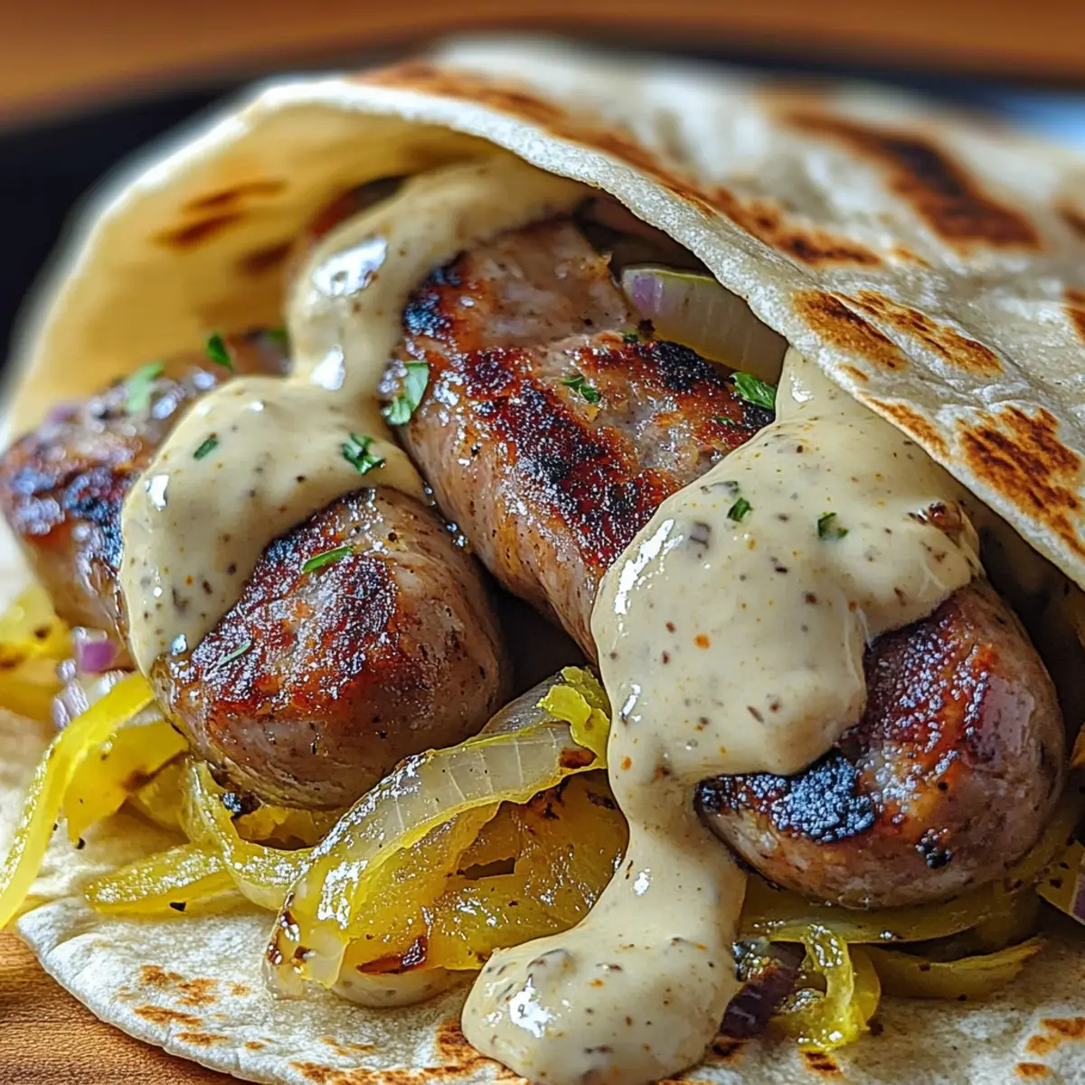 Ein wenig von der Sauce auf das Fladenbrot streichen und nach Belieben mit rot-kraut, karamellisierten Zwiebeln und Dill-Gewürzgurken belegen. Die gebratenen Bratwürste darauflegen und das Brot fest aufrollen, um die köstliche Füllung gut zu umschließen.