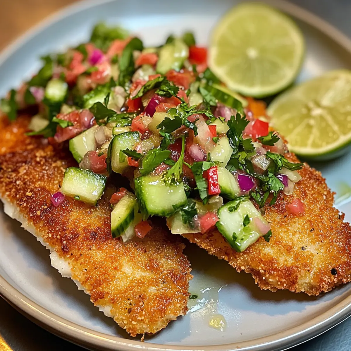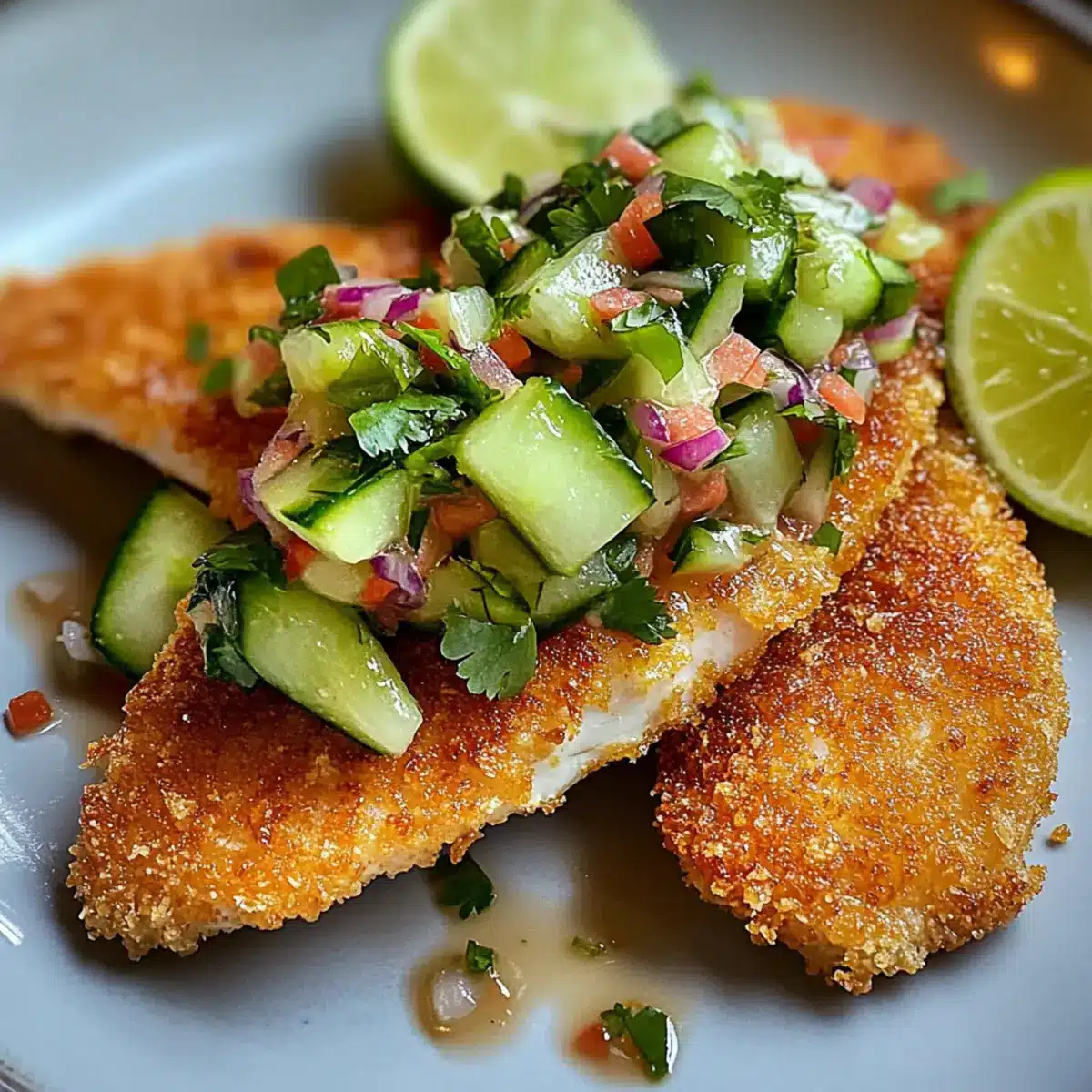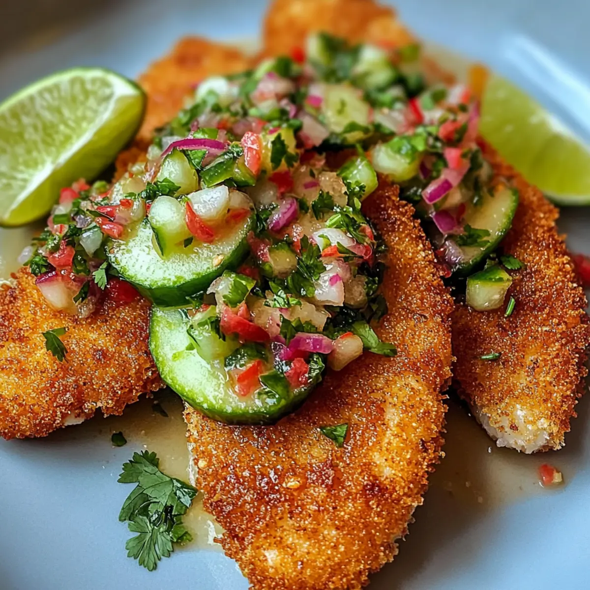 Die knusprigen Fischfilets auf einen Teller anrichten und großzügig mit dem Gurken-Ceviche belegen. Garniere das Gericht mit Limettenspalten und einem Spritzer Chiliöl für zusätzliche Würze. Dieses Gericht kombiniert die Aromen von Fisch Mailänder Art mit der Frische des Gurken-Ceviche, ideal für den perfekten Genuss!
