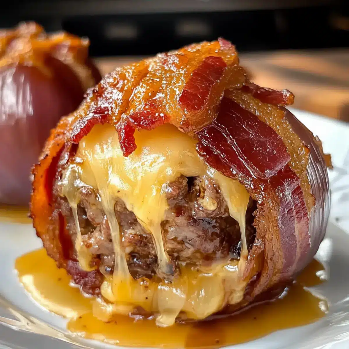 Legen Sie zwei Scheiben Bacon in Kreuzform auf Ihre Arbeitsfläche. Wickeln Sie jede Zwiebelbombe sorgfältig in die Bacon-Scheiben ein, sodass sie vollständig umschlossen ist. Wenn nötig, verwenden Sie einen Zahnstocher, um den Bacon an Ort und Stelle zu halten. Der eingelegte Bacon wird beim Backen knusprig und trägt zu einem großartigen Geschmack bei.