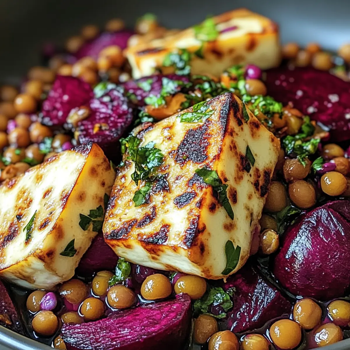 Lade die köstliche Mischung aus Linsen, Kichererbsen und Rüben auf einen großen Teller oder eine Schüssel. Lege die frisch gegrillten Halloumi-Scheiben darauf und achte darauf, dass sie schön platziert und sichtbar sind. Die Farben sollten lebendig wirken und ein appetitliches Bild bieten. Serviere das Gericht sofort für optimale Frische und Knusprigkeit.