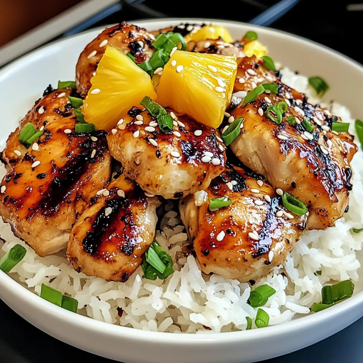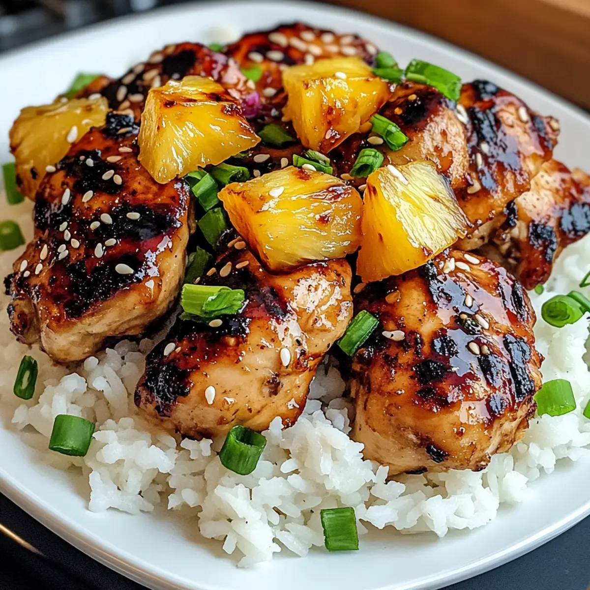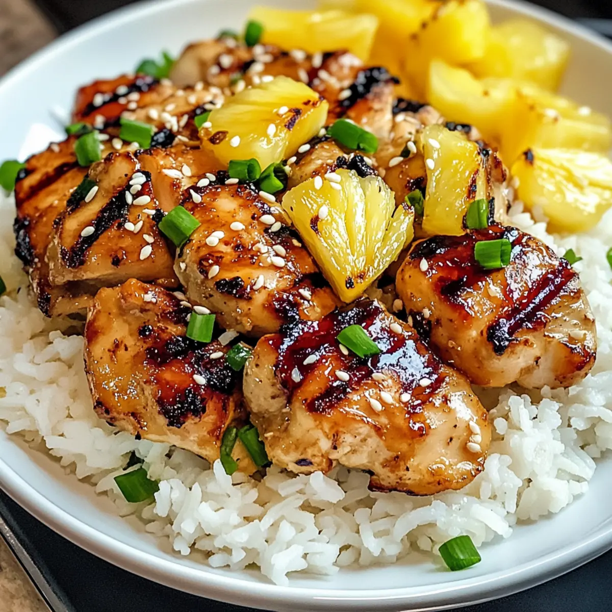 Schneiden Sie das gegrillte Hawaiianische Huhn gegen die Faser auf und servieren Sie es auf einer großzügigen Portion des cremigen Kokosreises. Garnieren Sie das Gericht mit frisch geschnittenen Frühlingszwiebeln und Sesamsamen für zusätzlichen Geschmack und eine ansprechende Präsentation. Genießen Sie Ihr tropisches Abendessen!