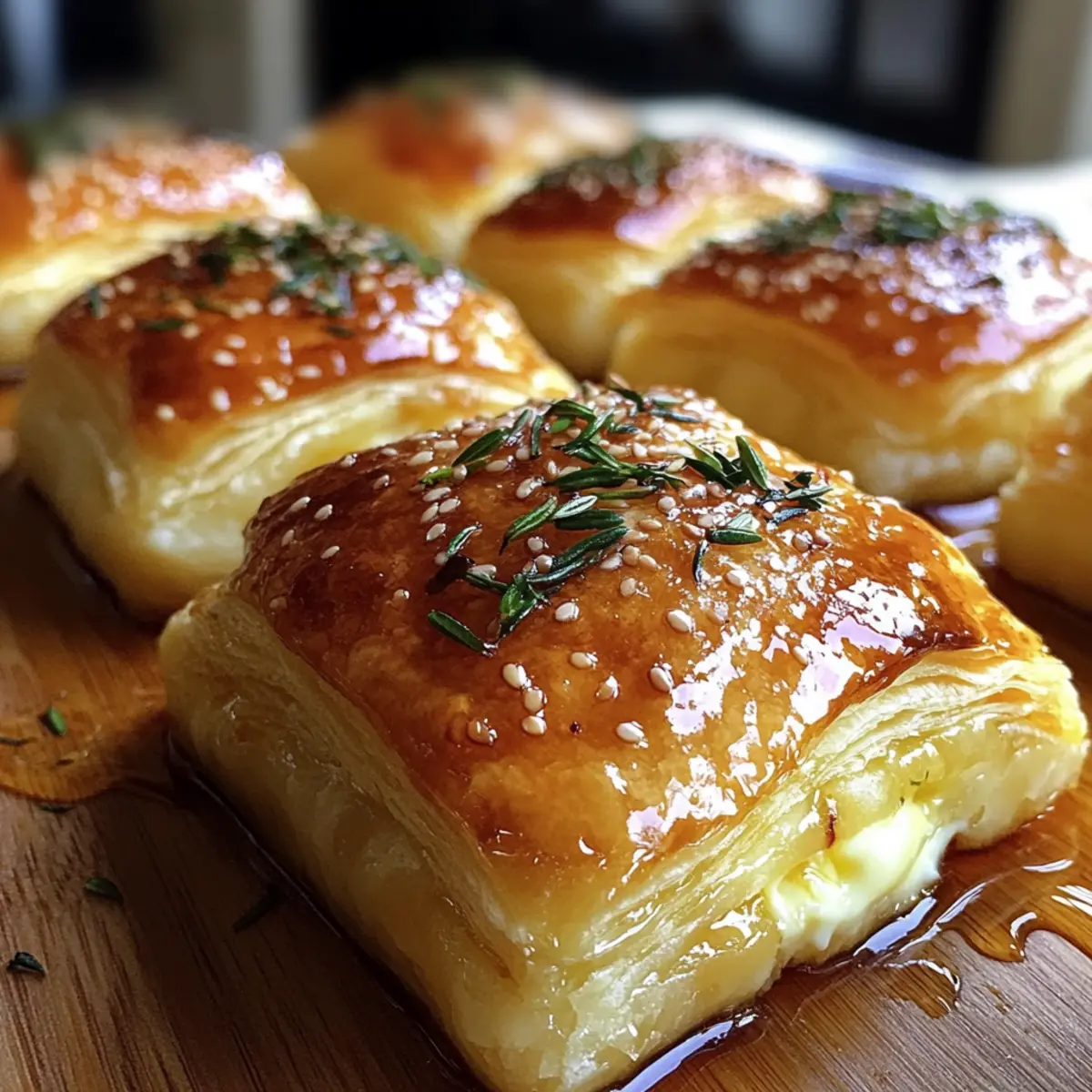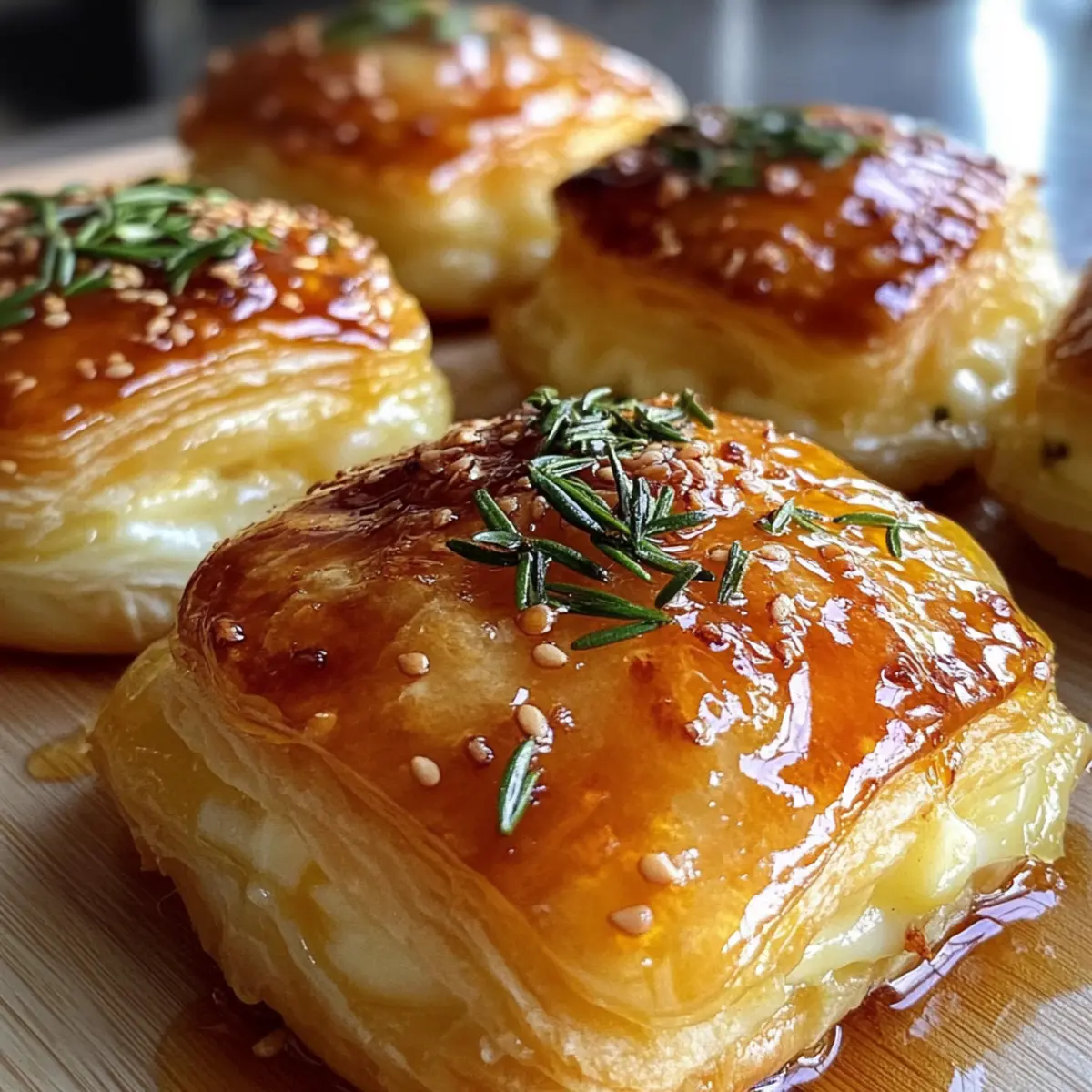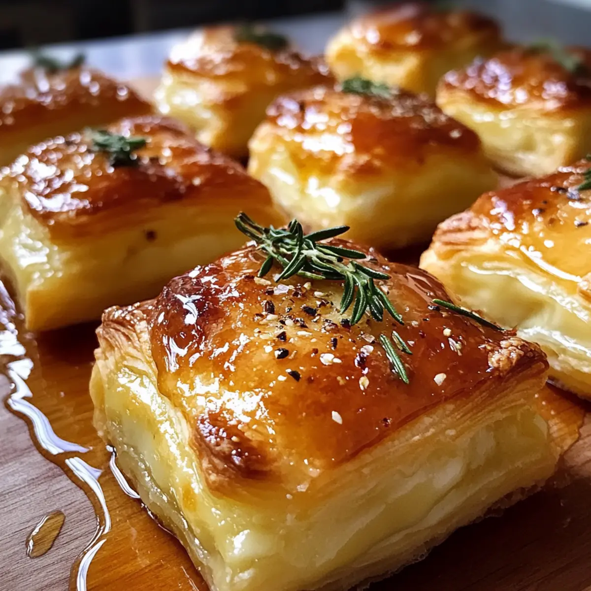 Nimm die Heißen Honig-Blätterteighäppchen aus dem Ofen und drizzel etwas zusätzlichen heißen Honig darüber. Garniere sie mit frischem Rosmarin und serviere sie warm. Diese köstlichen Häppchen sind das perfekte Highlight für jedes Fest!