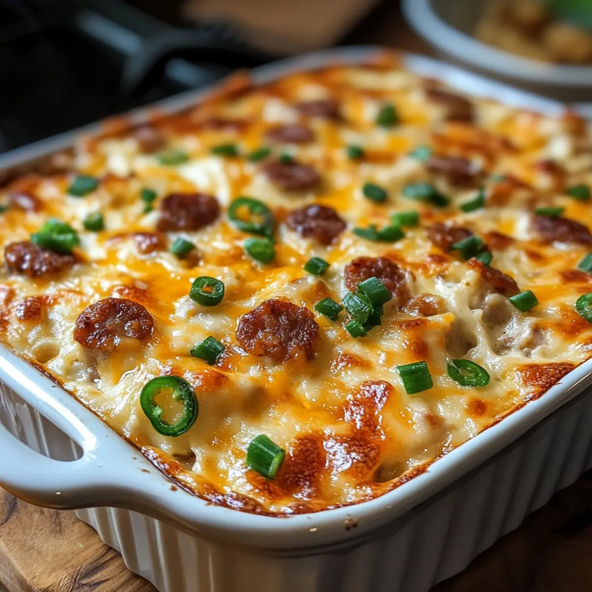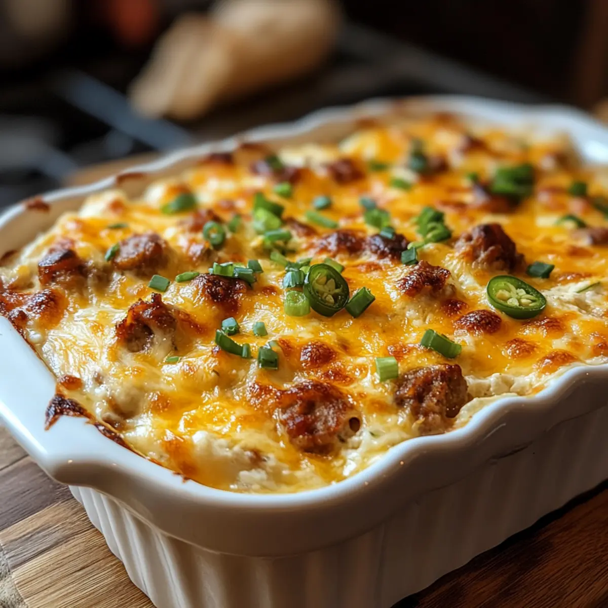 - Mischung gleichmäßig in der Backform verteilen und optional mit zusätzlichem Cheddar bestreuen. Für 30–35 Minuten backen, bis der Dip blubbert und goldbraun ist.