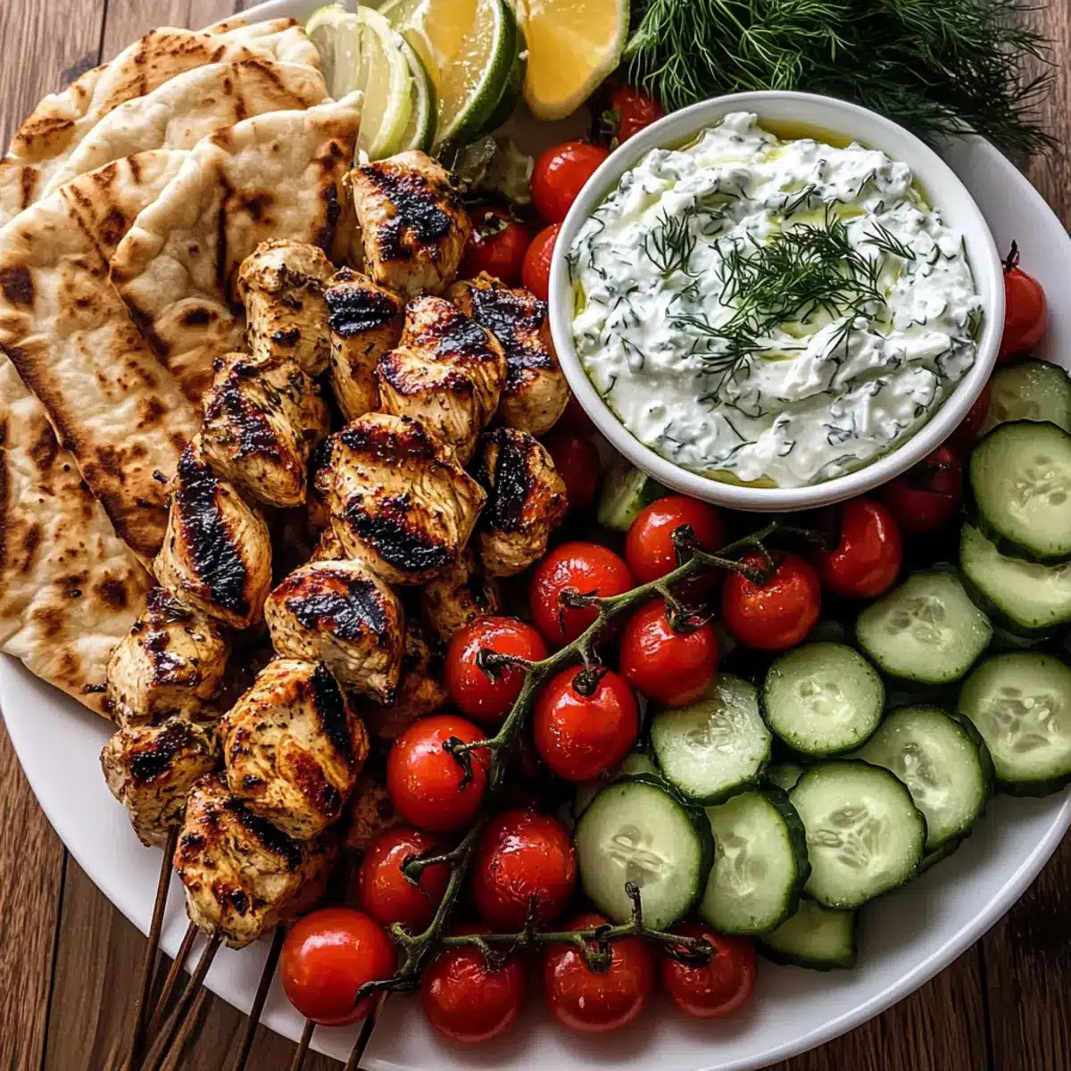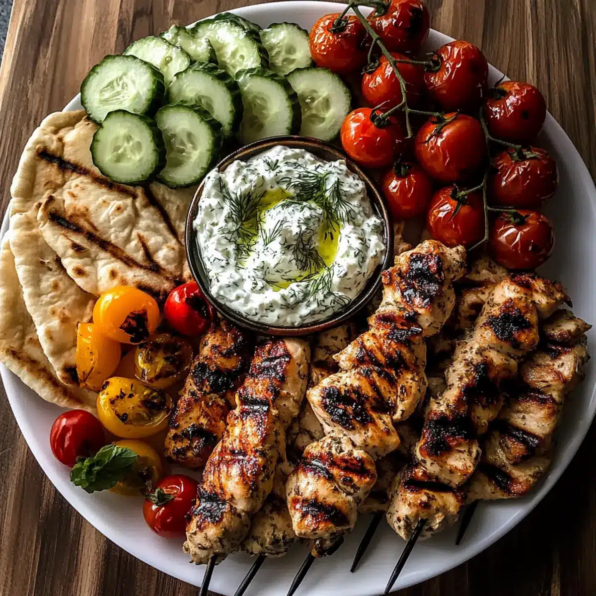 - Richte die gegrillten Hühnchenspieße auf einem großen Servierbrett an und ergänze das Brett mit warmem Pita-Brot, Cherrytomaten, Gurkenscheiben, Kalamata-Oliven und gerösteten Paprika.