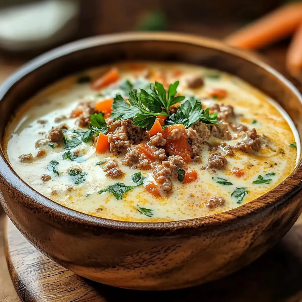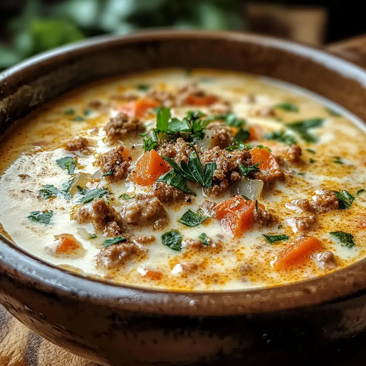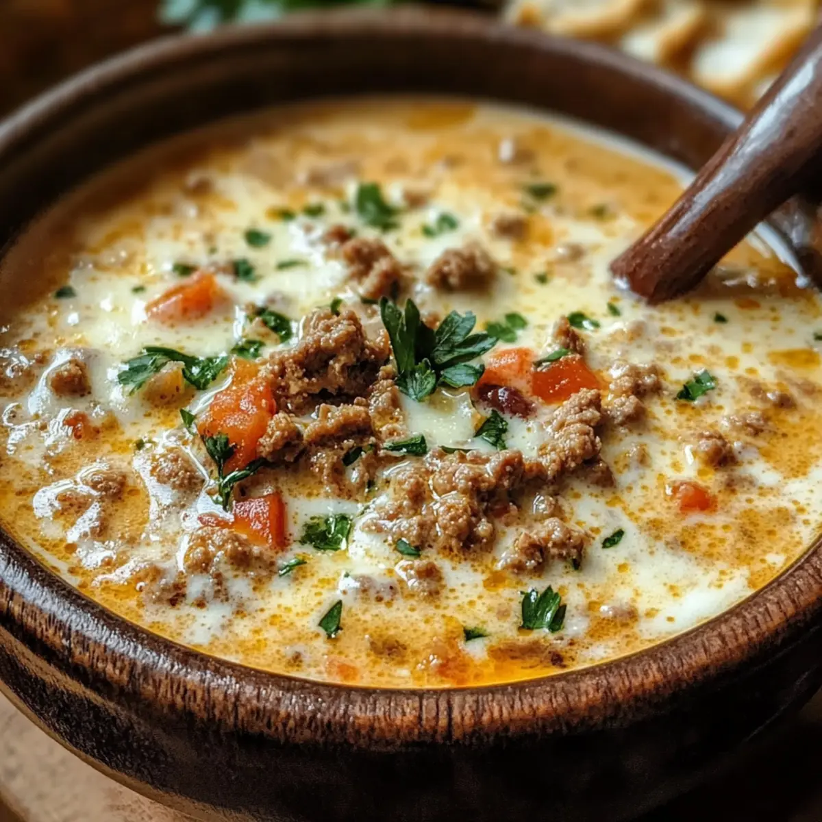 Cremiger Genuss: Diese Suppe hat eine samtige Konsistenz, die mit geschmolzenem Käse und Hackfleisch verführt.