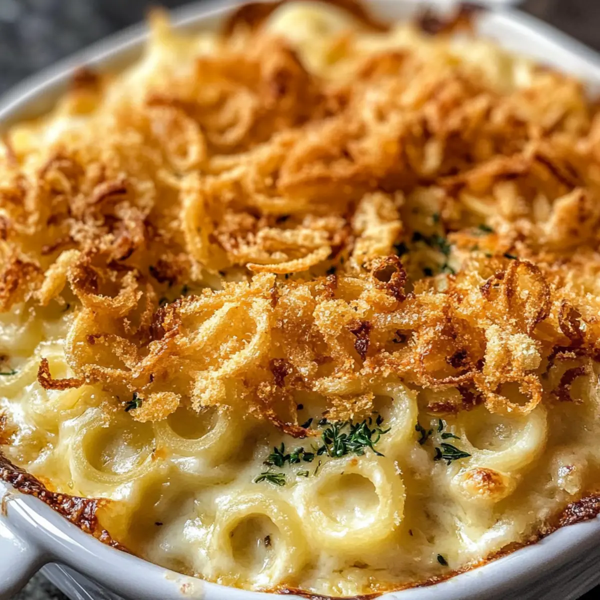 - Nimm das Käse Spätzle Gratin aus dem Ofen und lasse es kurz abkühlen, dann garniere es mit den knusprigen Zwiebeln und frisch gehacktem Schnittlauch.
