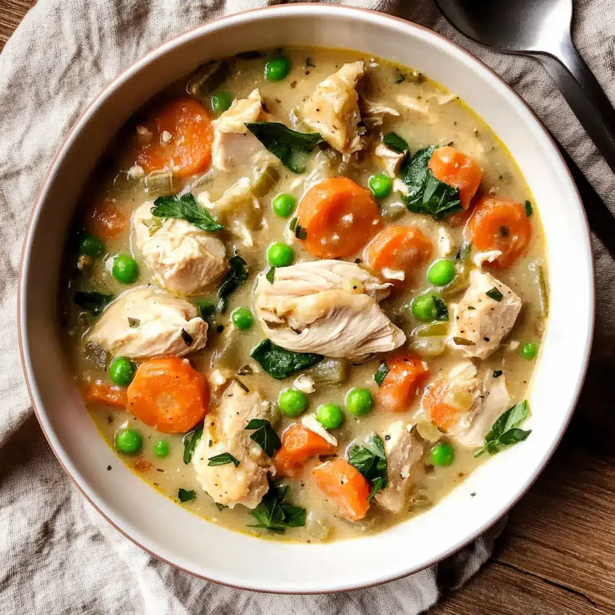 - Das zerkleinerte Hähnchen, die gefrorenen Erbsen, die frische Petersilie und den Babyspinat in den Topf geben. Weitere 5 Minuten köcheln lassen.
