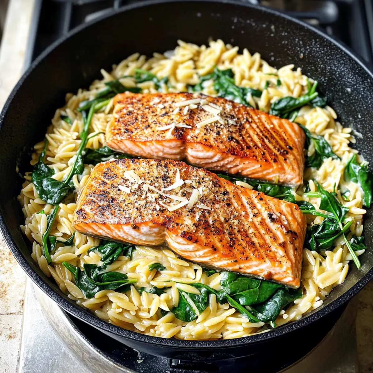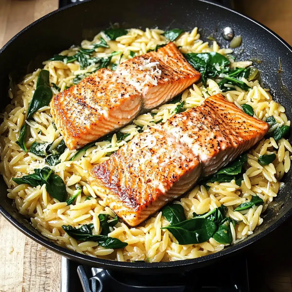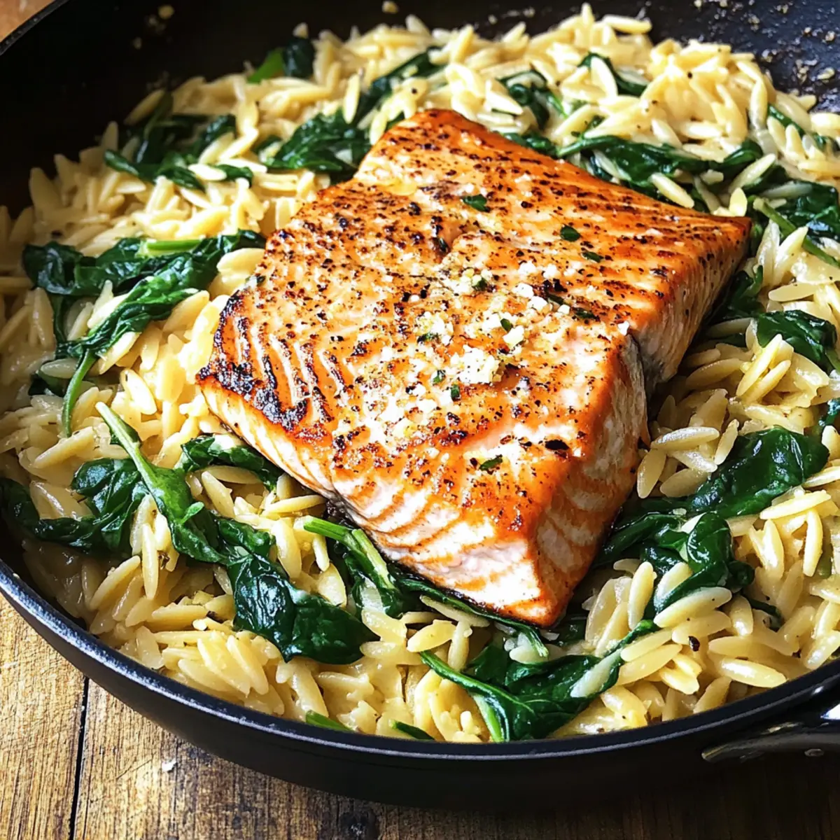 Legen Sie die angebratenen Lachsfilets wieder in die Pfanne und lassen Sie alles noch einmal 2-3 Minuten köcheln, bis der Lachs durchwärmt ist. Servieren Sie das Gericht mit zusätzlichem frisch gemahlenem Pfeffer und optionalen Chiliflocken. Ihr köstlicher Lachs mit Zitronen-Orzo ist nun bereit, auf den Tisch zu kommen!