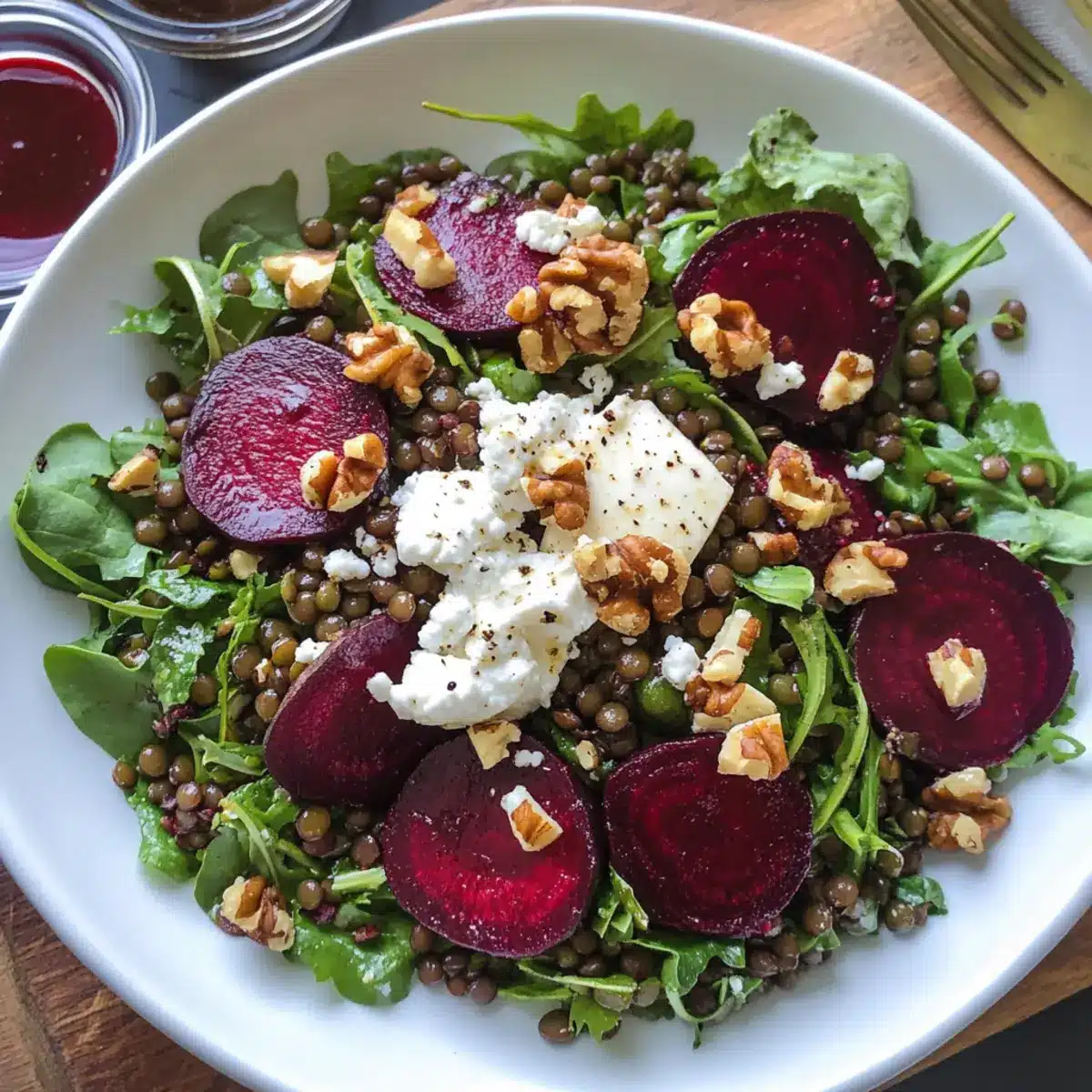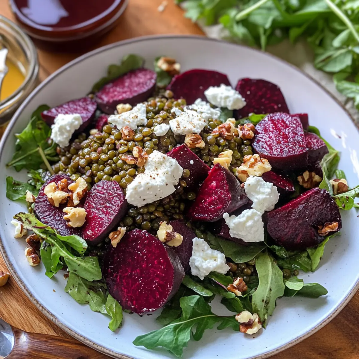 - Vermengen Sie in einer großen Schüssel die Rüben, Linsen und Blattsalate. Fügen Sie Ziegenkäse und Walnüsse hinzu.
