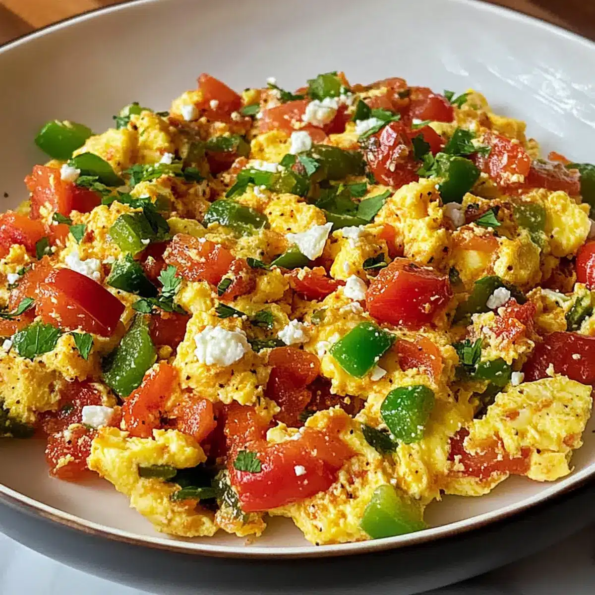 Wenn die Eier fast vollständig gestockt sind, streue den zerbröckelten Feta-Käse gleichmäßig über die Mischung. Lasse alles noch 1 Minute weitergaren, damit der Käse schmelzen kann. Das sorgt für eine cremige, pikante Note in deiner Menemen Türkische Eier-Scramble.