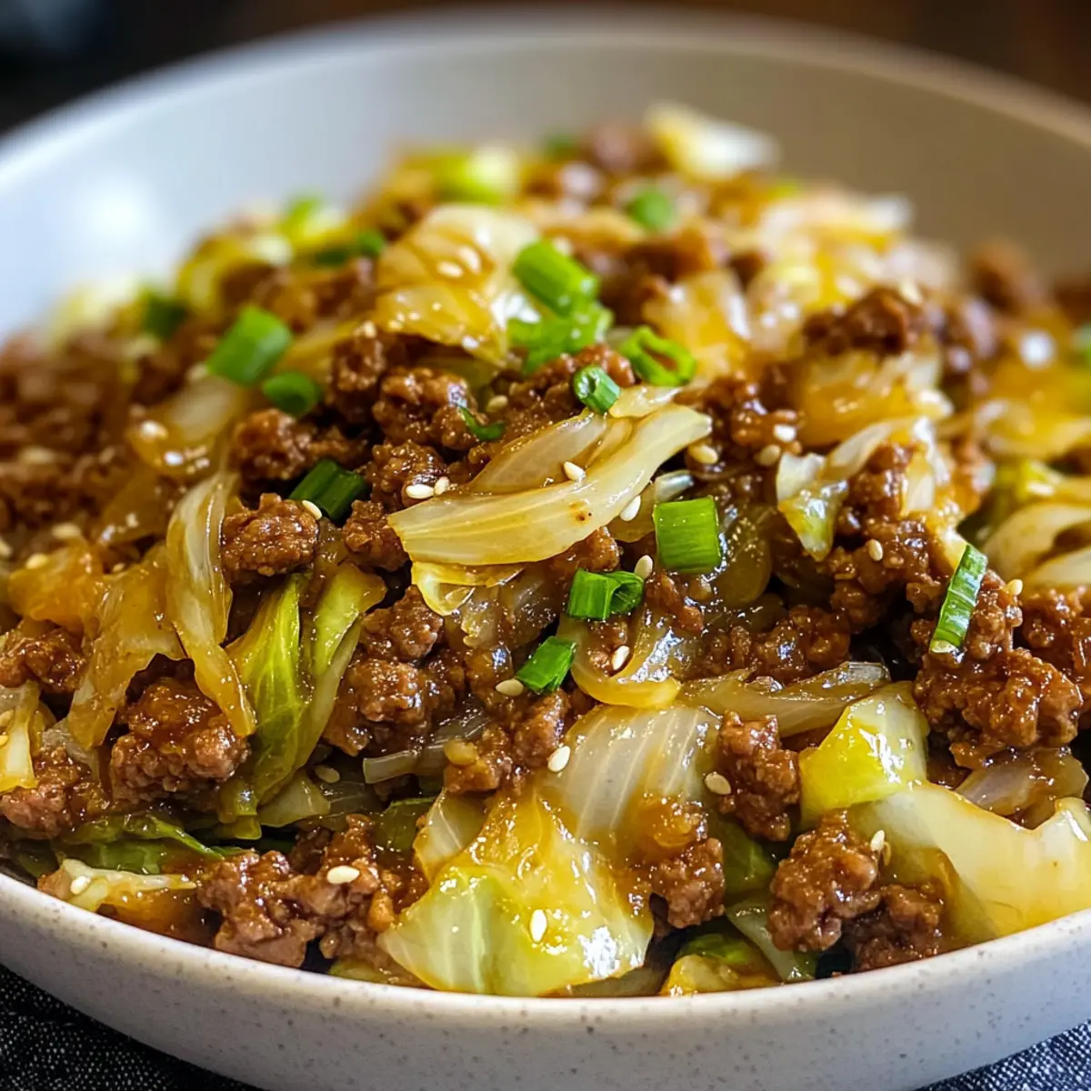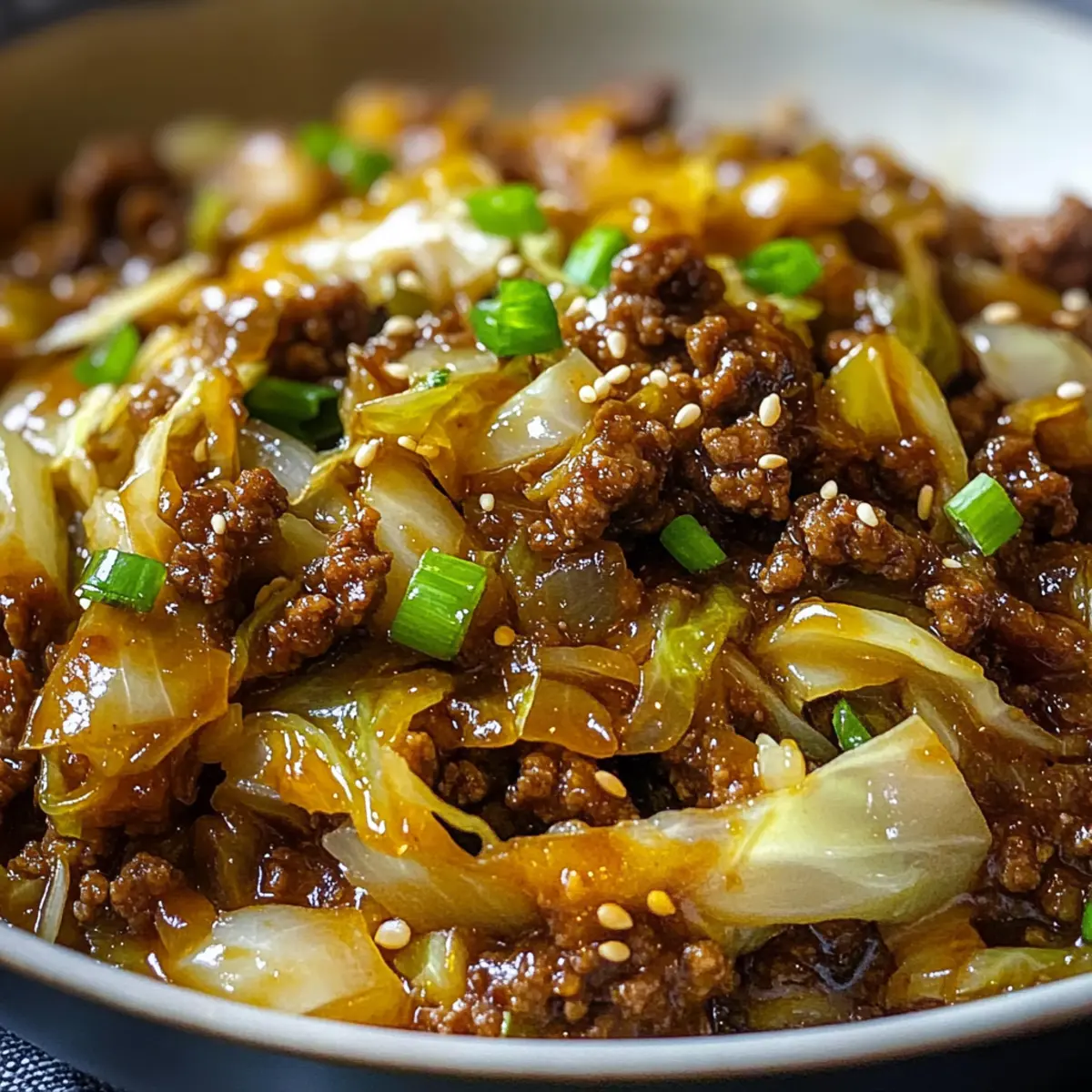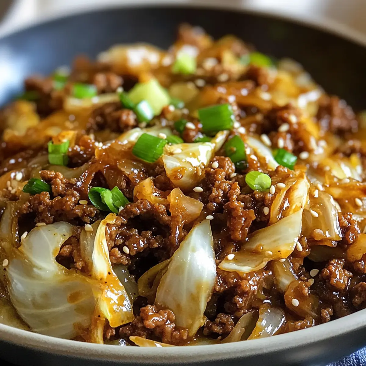 Nimm die Pfanne vom Herd und garniere das Gericht mit frisch gehackten Frühlingszwiebeln und optional mit gerösteten Sesamsamen. Serviere das Mongolisches Rinderhackfleisch mit Kohl sofort, um die frischen Aromen und die leuchtenden Farben voll auszukosten.