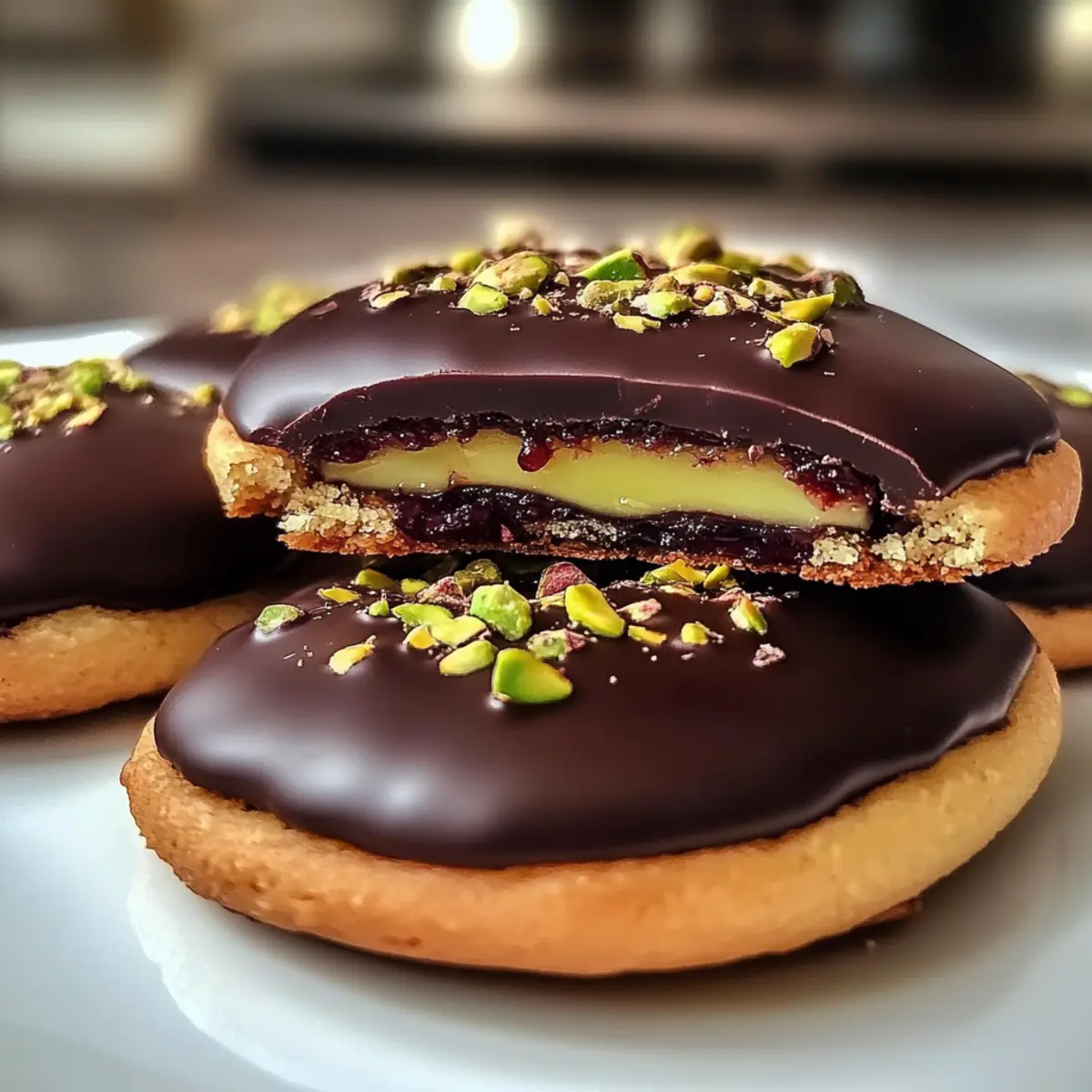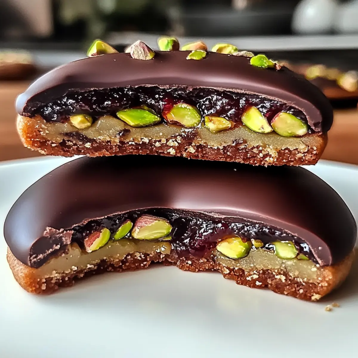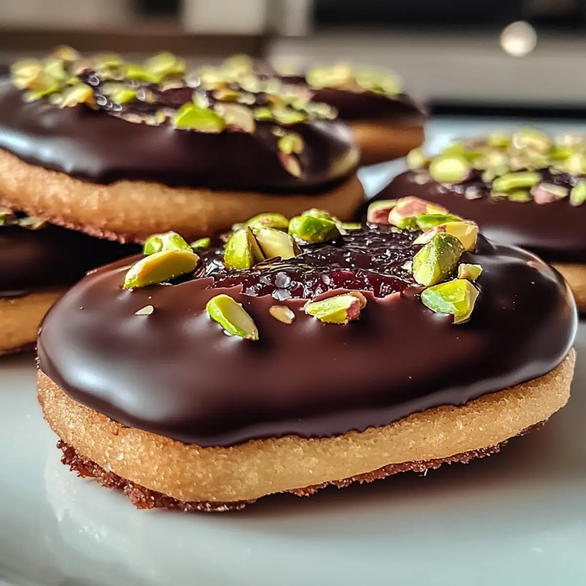 Schmelze die Kuvertüre in einem Wasserbad oder in der Mikrowelle, bis sie glatt ist. Tauche jedes Keks in die geschmolzene Schokolade oder gieße die Schokolade gleichmäßig darüber. Bestreue sie sofort mit den gehackten Pistazien, bevor die Schokolade fest wird, um eine dekorative Note zu verleihen. Lass die Plätzchen auf einem Gitterrost fest werden und genieße das Ergebnis deiner Mozartplätzchen!