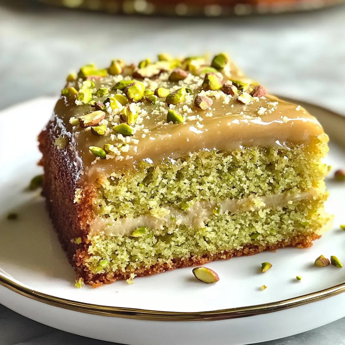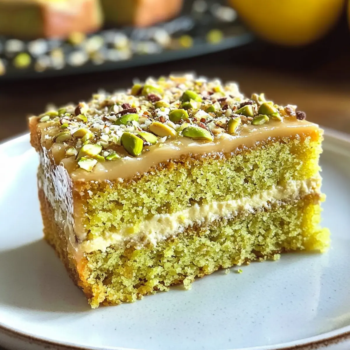 Sobald der Kuchen aus dem Ofen kommt und noch warm ist, trage die Zitronenglasur gleichmäßig darüber auf. Streue die gehackten Pistazien als Topping darüber, um dem Kuchen eine zusätzliche Knusprigkeit und ein schönes Aussehen zu verleihen.