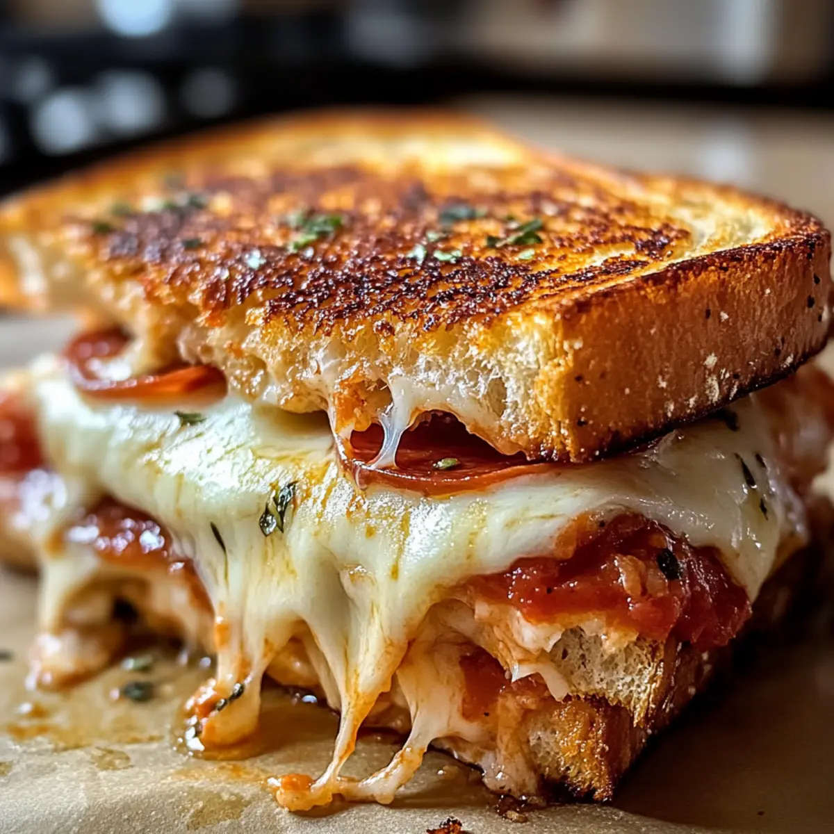 Wende das Sandwich vorsichtig um und brate die andere Seite ebenso goldbraun, was weitere 3-4 Minuten dauert. Achte darauf, dass der Käse vollständig geschmolzen und die Brote knusprig sind. Nach dem Garen vom Herd nehmen, leicht abkühlen lassen, dann in Stücke schneiden und optional mit frischem Basilikum garnieren. Serviere mit zusätzlicher Marinara-Sauce zum Dippen.