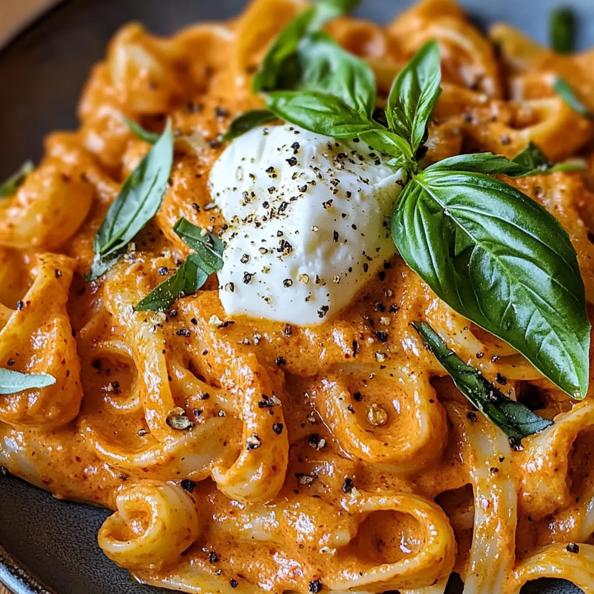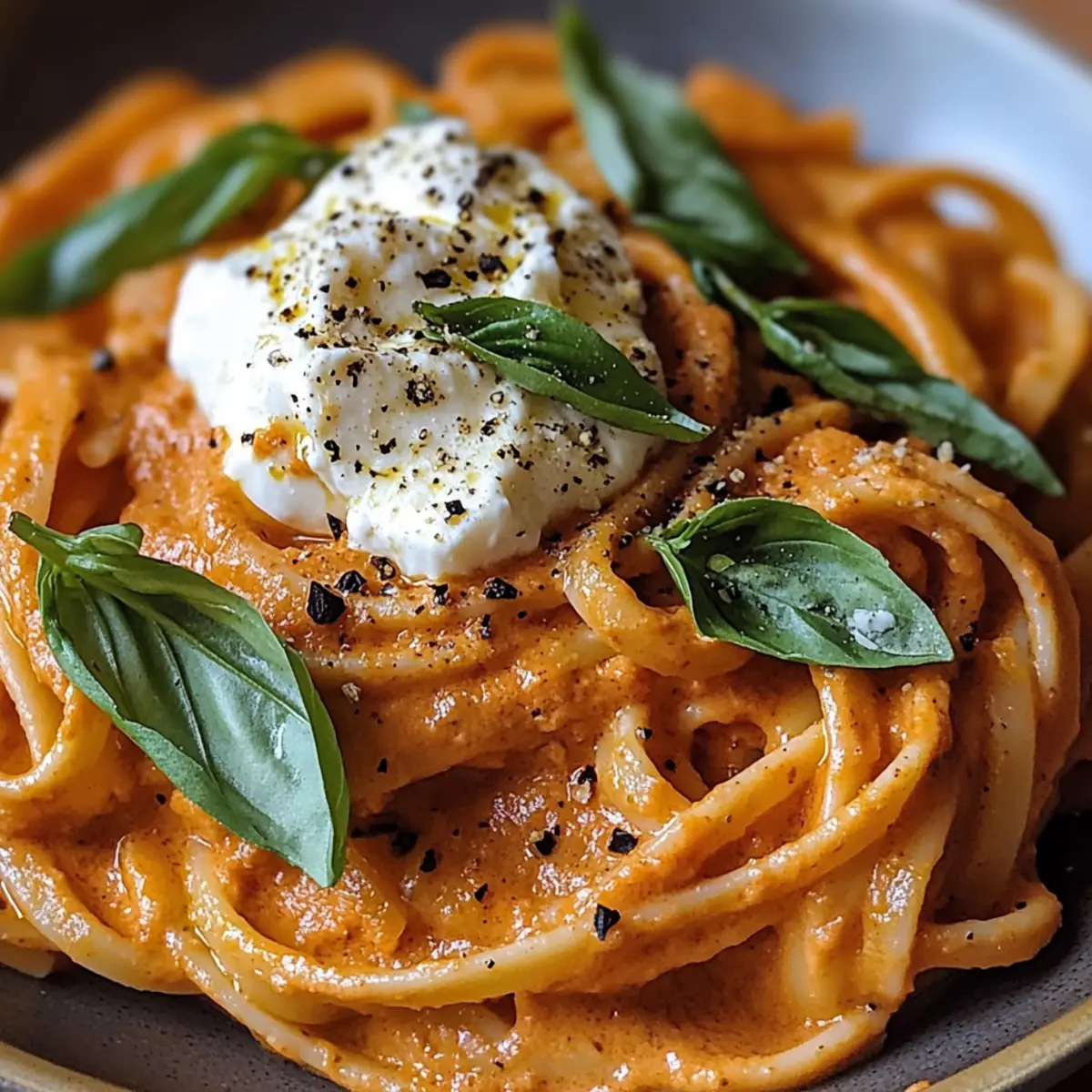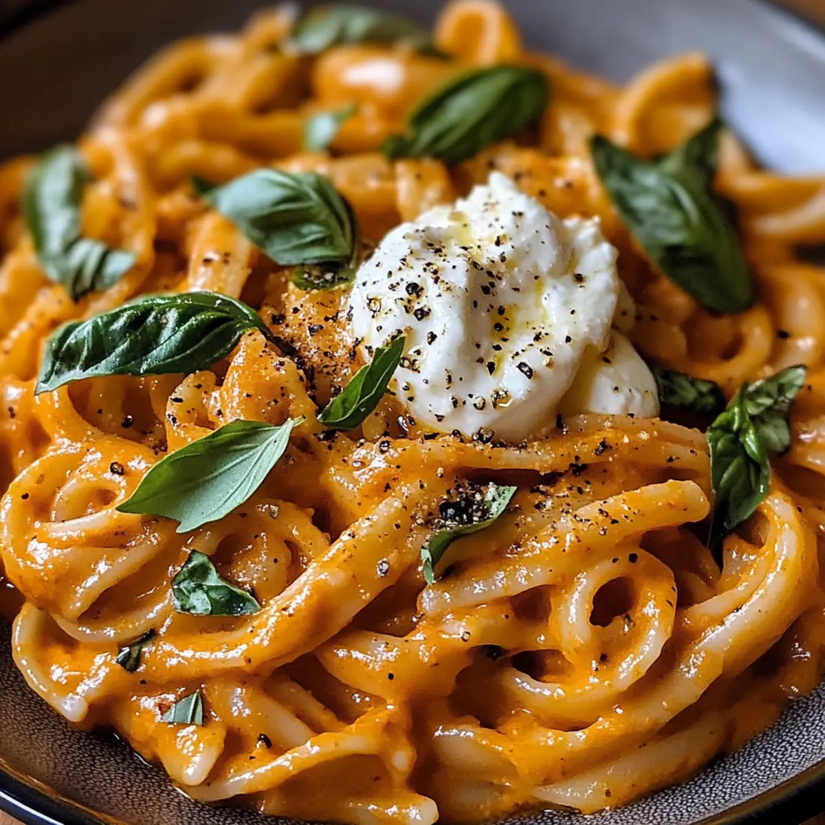 Rote Paprika Pasta mit Burrata und Kräutern genießen