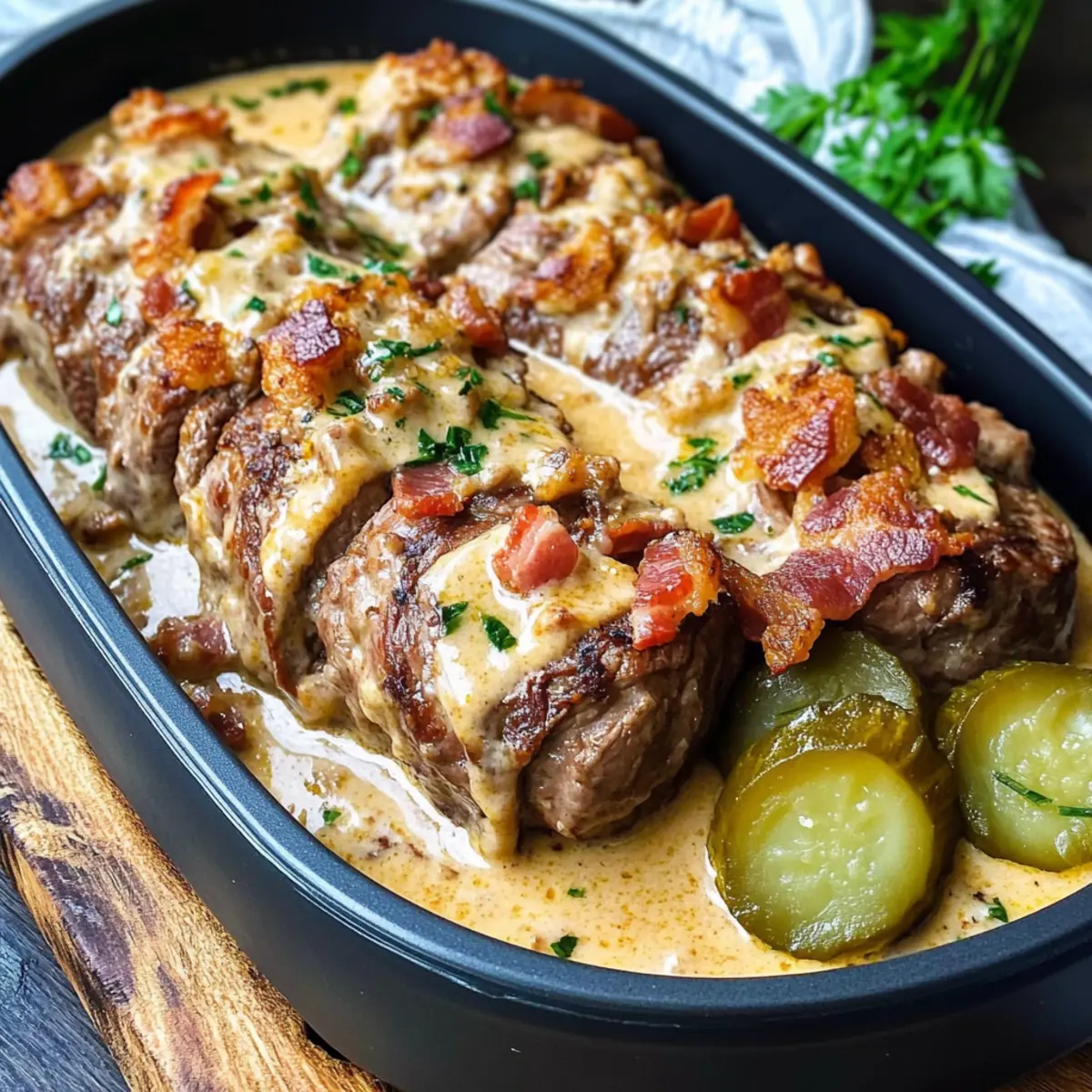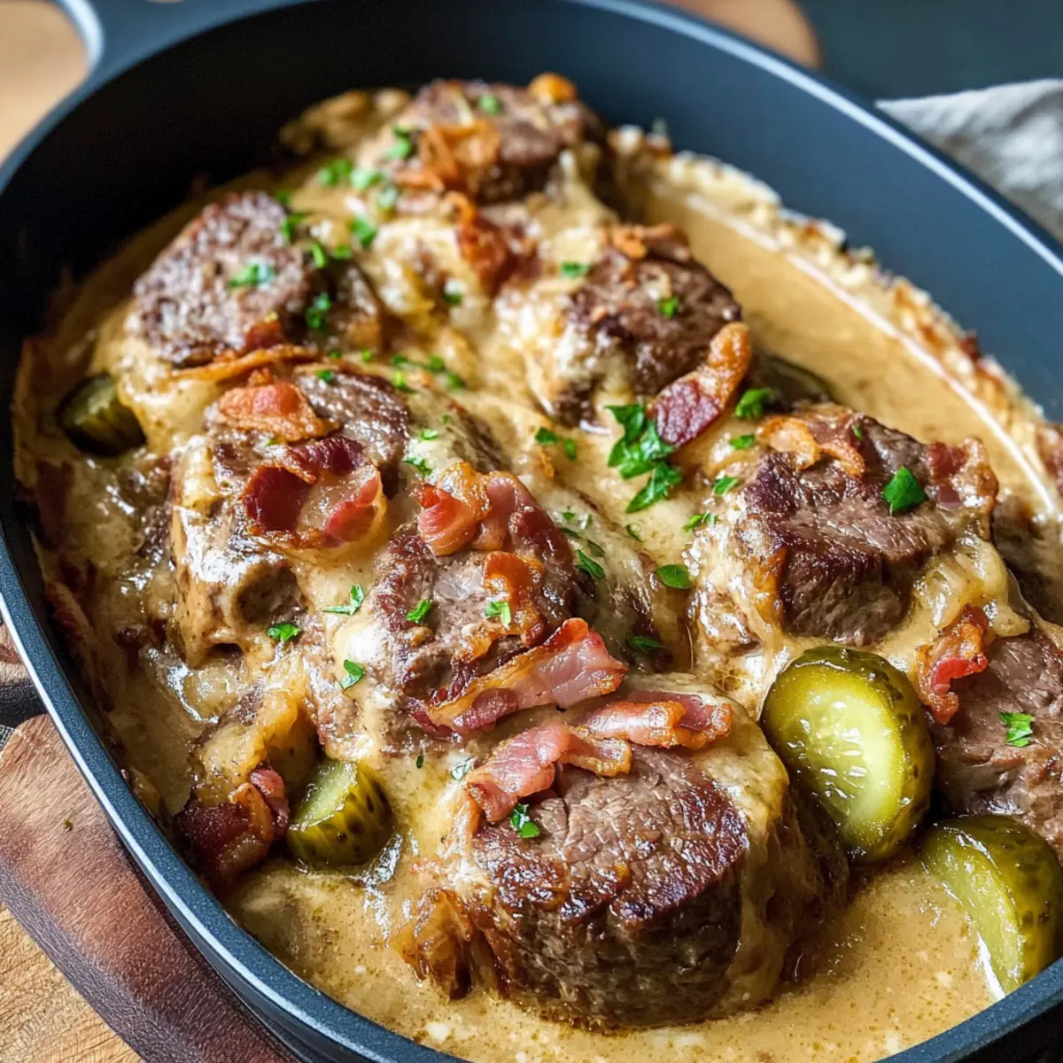 Herzhafter Genuss: Die Kombination aus zartem Rindfleisch, knusprigem Bacon und würzigen Gewürzgurken sorgt für ein Geschmackserlebnis, das niemanden enttäuschen wird.