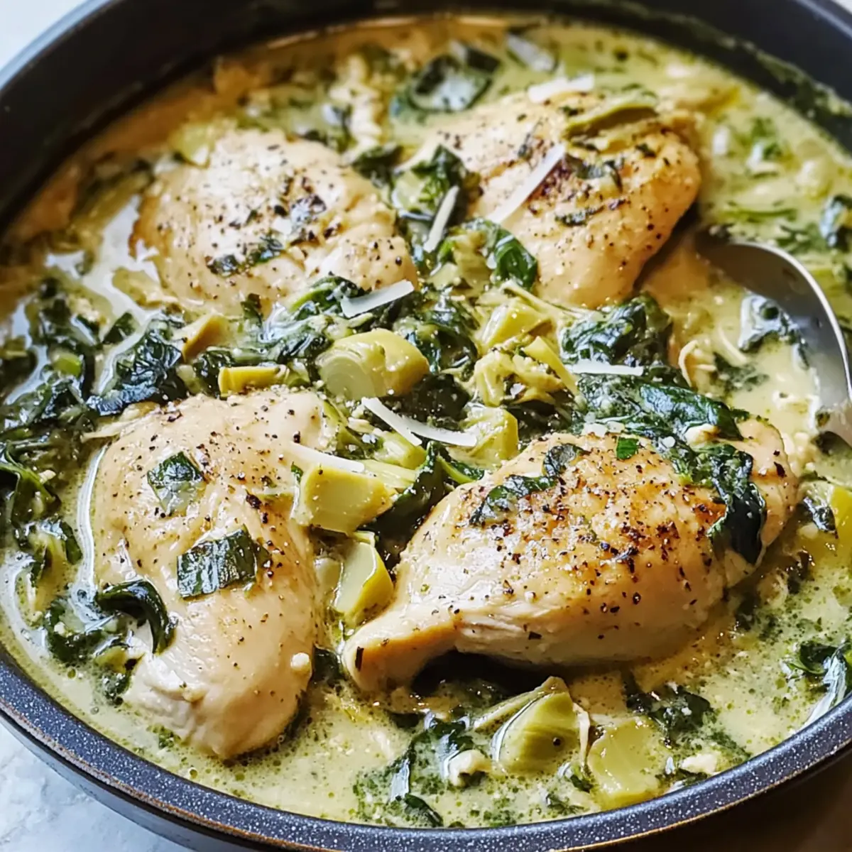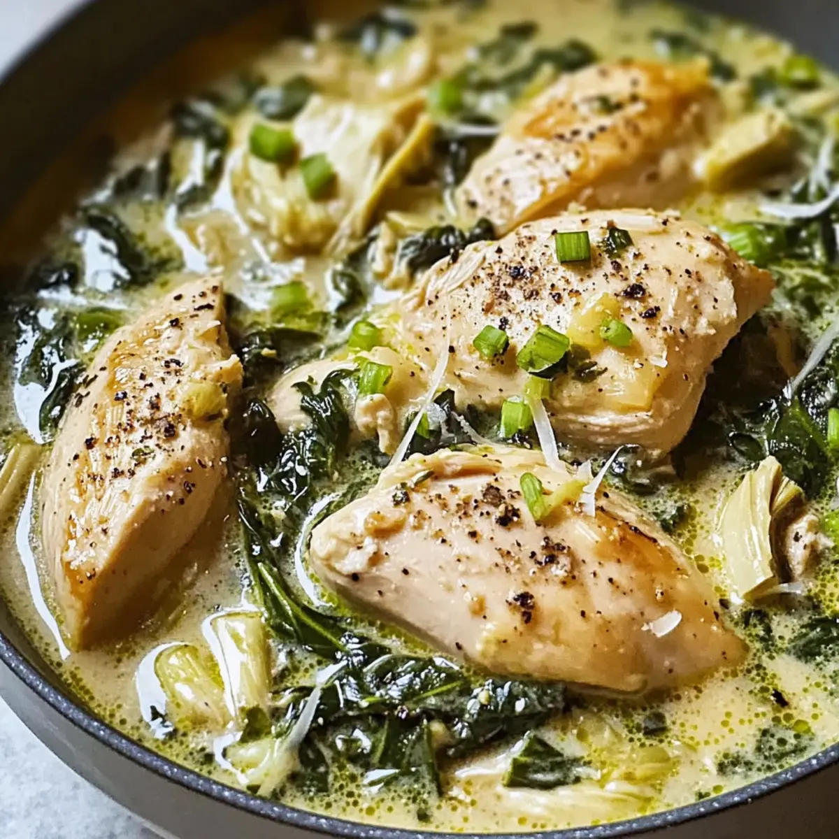 Vegane Option: Ersetze das Hühnchen durch Kichererbsen oder Tofu, um einen leckeren, pflanzlichen Spinat-Artischocken-Eintopf zu zaubern.