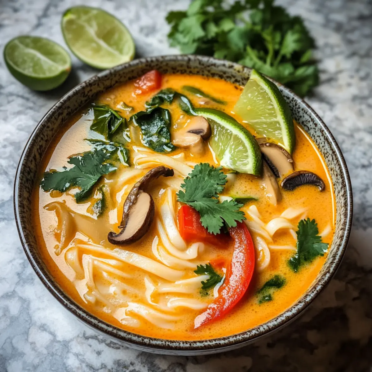 Einfache Zubereitung: Du benötigst nur 20 Minuten, um diese köstliche Thailändische Curry-Kokos-Udon-Nudelsuppe auf den Tisch zu bringen, perfekt für hektische Abende.
