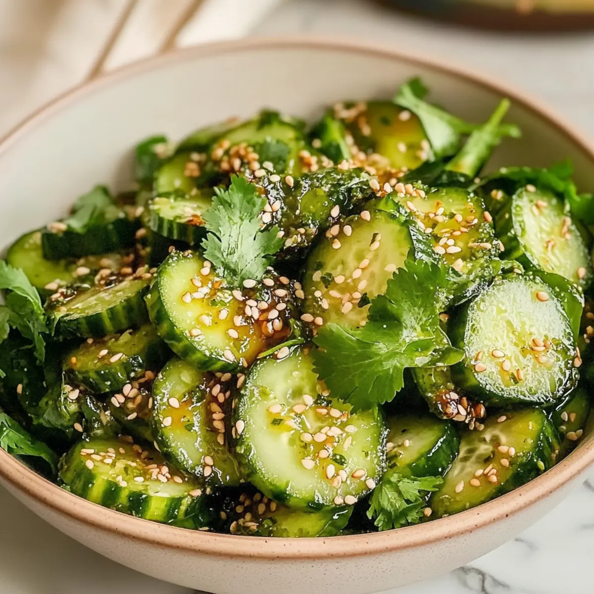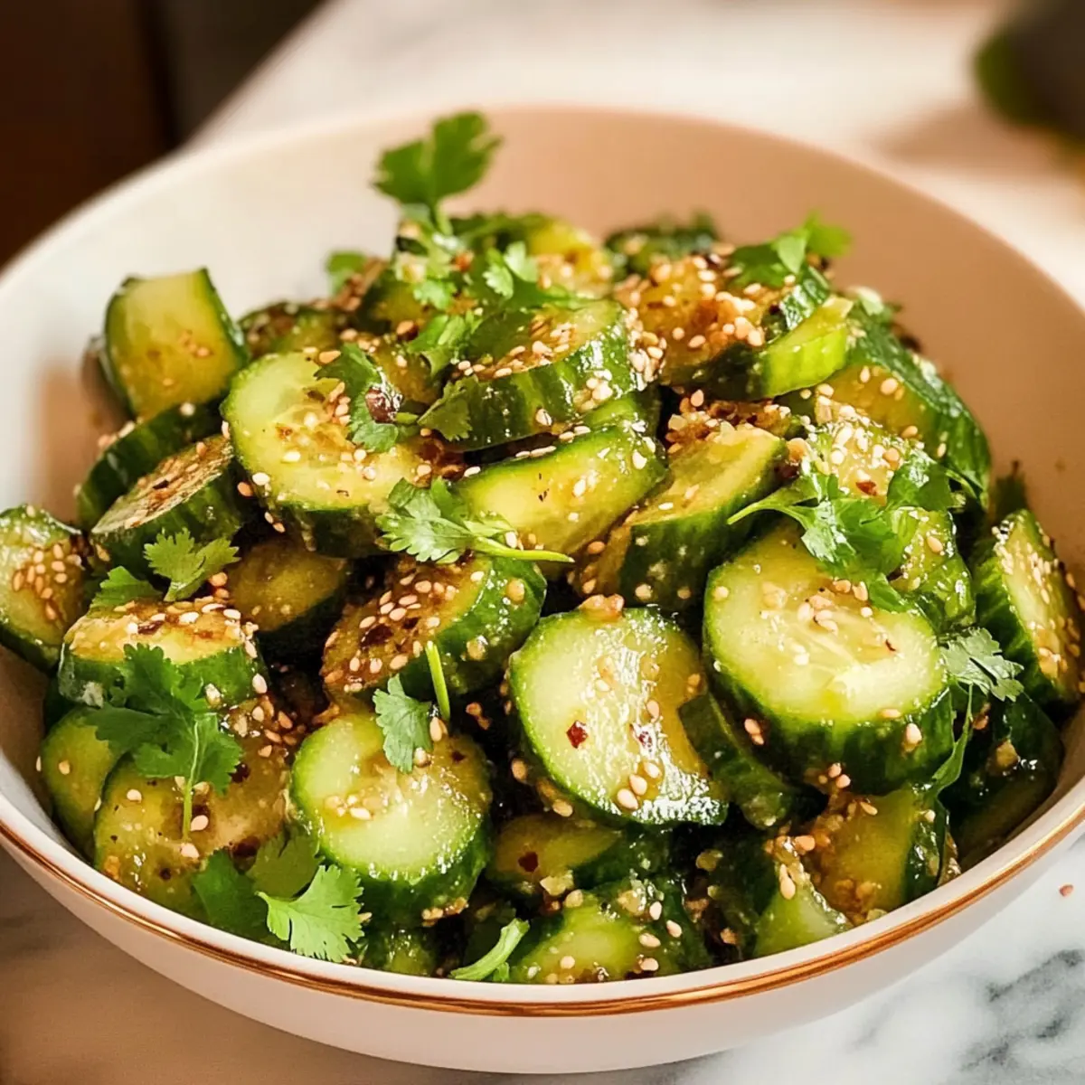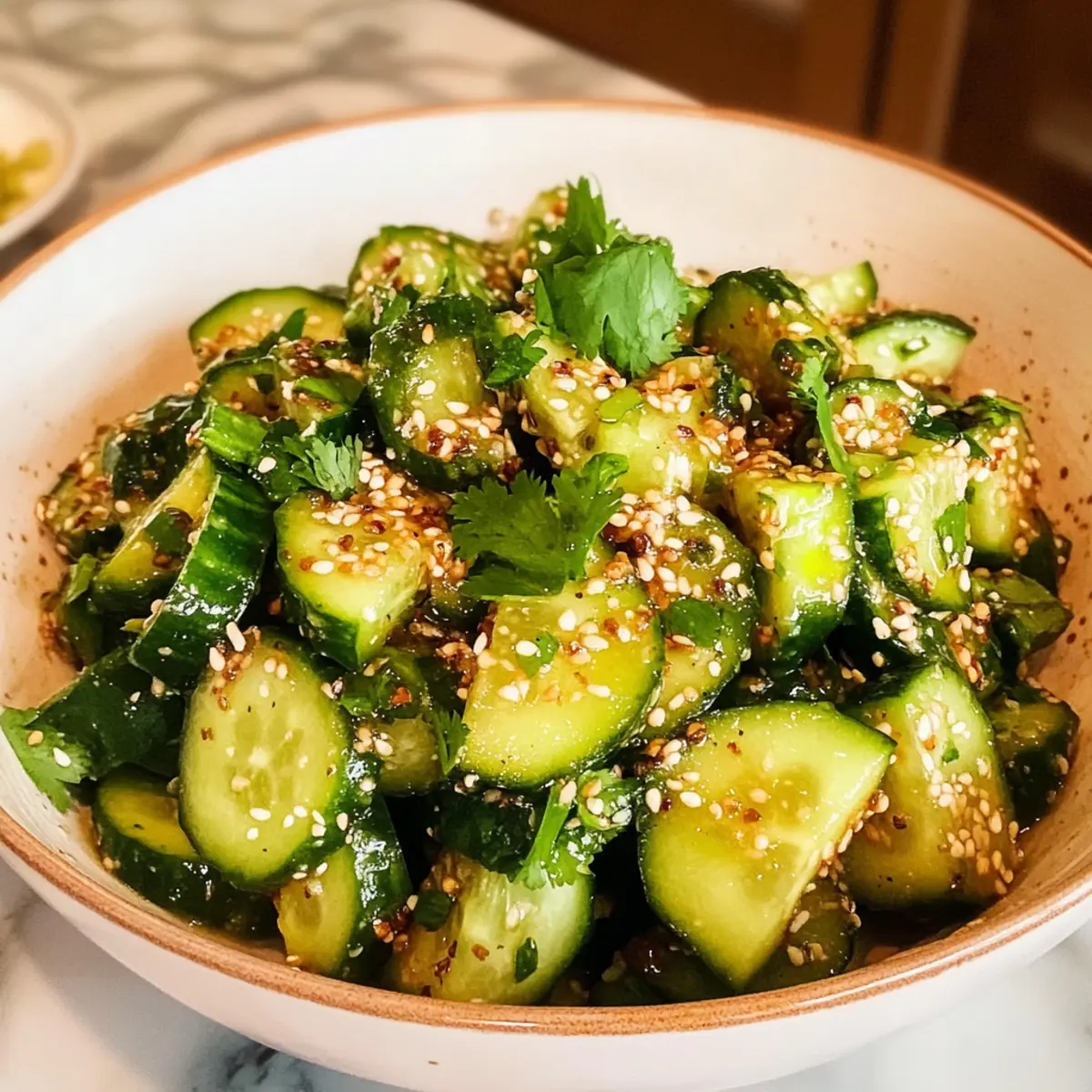 Vor dem Servieren fügst du 1 Esslöffel geröstete Sesamsamen und eine Handvoll frisch gehackten Koriander hinzu. Vermenge alles sanft, um die Zutaten gleichmäßig zu verteilen. Dieser Zerdrückter Gurkensalat Rezept sollte kalt serviert werden, um seine Frische und Knackigkeit zu genießen.